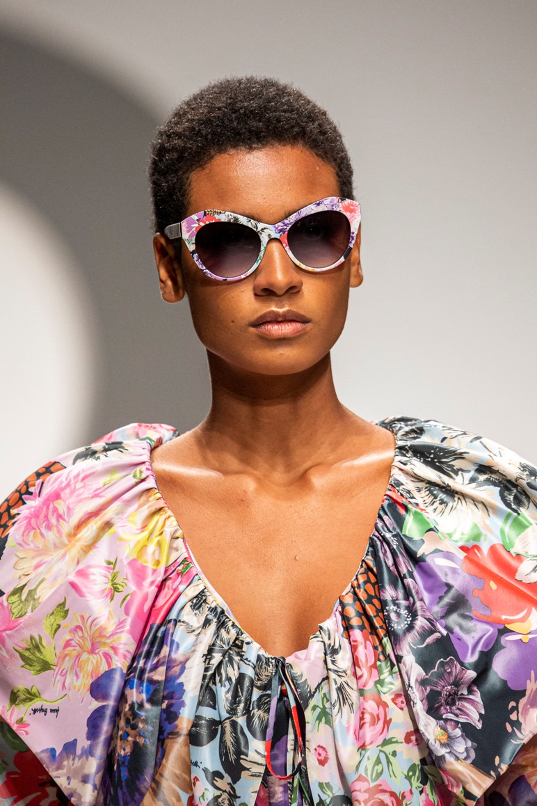 Le scarpe sono basse, mocassini da marinaio per gli outfit più quotidiani, o mules dal tacco comodo stampate con il logo, fiori, o in tessuto, accompagnano gli abiti più importanti. Divertenti, eccessivi, gli occhiali, grandi e dalla montatura stampata. Le borse riproducono il logo e sono shopper, piccole, a mano o a tracolla.