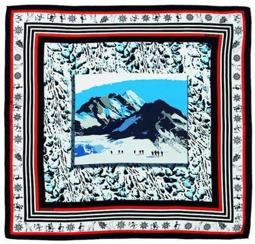 L’evento “Foulard delle montagne”, curato da Aldo Audisio, Laura Gallo e Cristina Natta-Soleri che hanno anche stilato un ricco catalogo edito da Priuli & Verlucca (destinato a costituire il nono volume della collana Raccolte di Documentazione del Museo Nazionale della Montagna), non propone solo pezzi griffati, ma anche modelli semplici in tessuti meno nobili della seta come cotone e lana e persino materiali sintetici come acetato, rayon, poliestere. A Courmayeur dunque si può ripercorrere la storia completa di questo oggetto: la nascita e l’evoluzione di un accessorio in must-have, dedicando un focus speciale a singole storie, come quella di Caty Latham, storica illustratrice di Hermès o quella di un singolare foulard del 1931 su cui sono ricamate le firme di 92 alpinisti o ancora quella del ruolo di un simile accessorio nell’alta moda sartoriale.