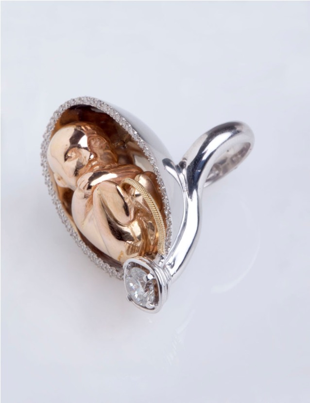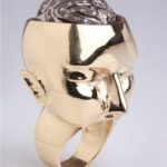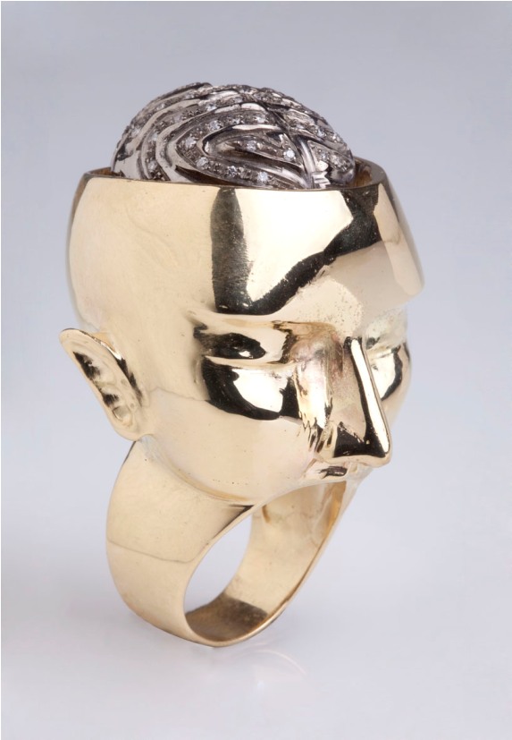 Ed eccoci alla p/e 2012. Assecondando il motivo che ha ispirato gli abiti di Guillermo Mariotto anche Gianni de Benedittis parla di un nuovo Rinascimento, ma misteriosamente chiama la collezione Fugadafermo. “Un nuovo Rinascimento è possibile -spiega -attraverso un efficace recupero delle emozioni e quindi della memoria, intercettando tradizioni di stile di culture lontane nel tempo e nello spazio”. Allora come Mariotto si rifà ai Maya e a Leonardo. Dei primi prende lo spunto per riprodurre il famoso calendario su un anello; si ipira poi con libertà ai disegni di anatomia di Leonardo in tre anelli in oro e diamanti per esporre le sue riflessioni sulla memoria. Memoria genetica, è un anello dove un piccolo feto umano è racchiuso nella cavità lucida di una mezza placenta orlata di diamanti; ancora 2 anelli per rappresentare la Memoria cerebrale dove un cervello troneggia solenne prima in una silhouette di rubini e poi nel tuttotondo di una testa umana. Pieghe di memoria sono orecchini in argento. Poi ritorniamo al tema della decontestualizzazione degli oggetti quotidiani. Oro e diamanti per il Fan Ring, l’ anello ventilatore; Snorkeling e invece anello leggero come un soffio, quasi surreale.