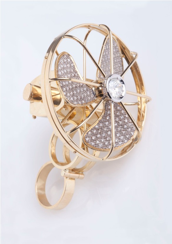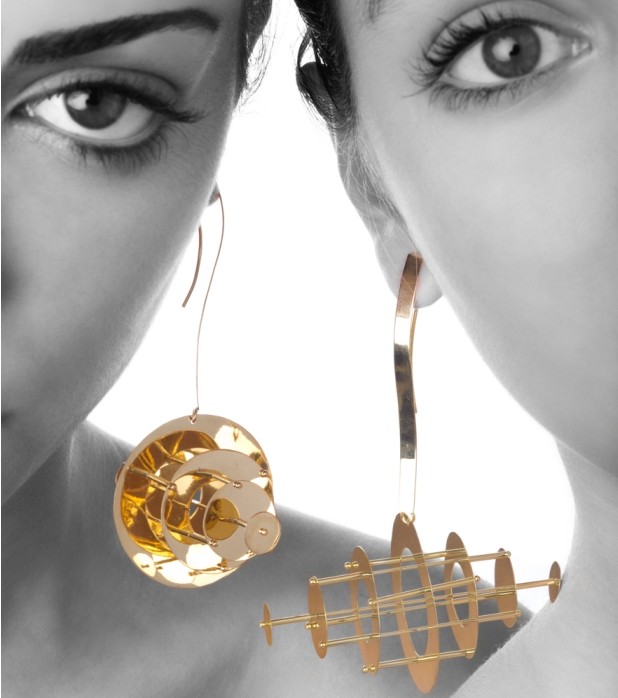 Non si tratta della prima volta. Nel luglio del 2009 la collezione che accompagnava gli abiti Gattinoni prendeva il nome di Sfere Armillari e si rifaceva a questi strumenti antichi utilizzati per esprimere il moto dei pianeti. Ellissi e cerchi in metallo prezioso ruotavano liberi intorno ad un asse acquistando volume e dando vita orecchini importanti. Ma già qui si leggeva quella che è una delle caratteristiche del gioiello di Gianni De Benedittis: il movimento. Gioielli in movimento vincono sull’immobilità della gioielleria tradizionale costruita grazie alla giustapposizione di metallo e gemme. Gioielli che vibrano ed assecondano ogni movimento del corpo femminile.