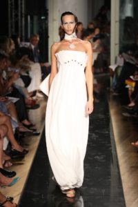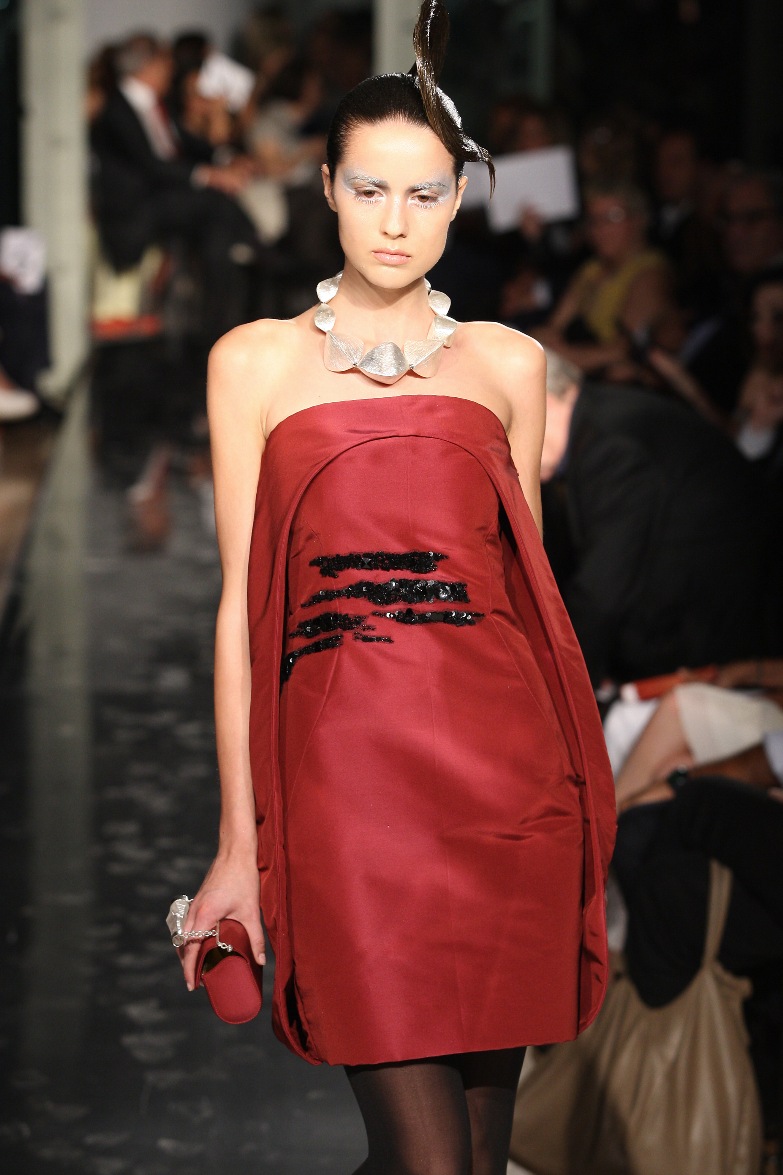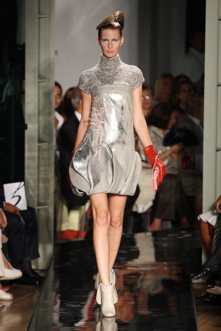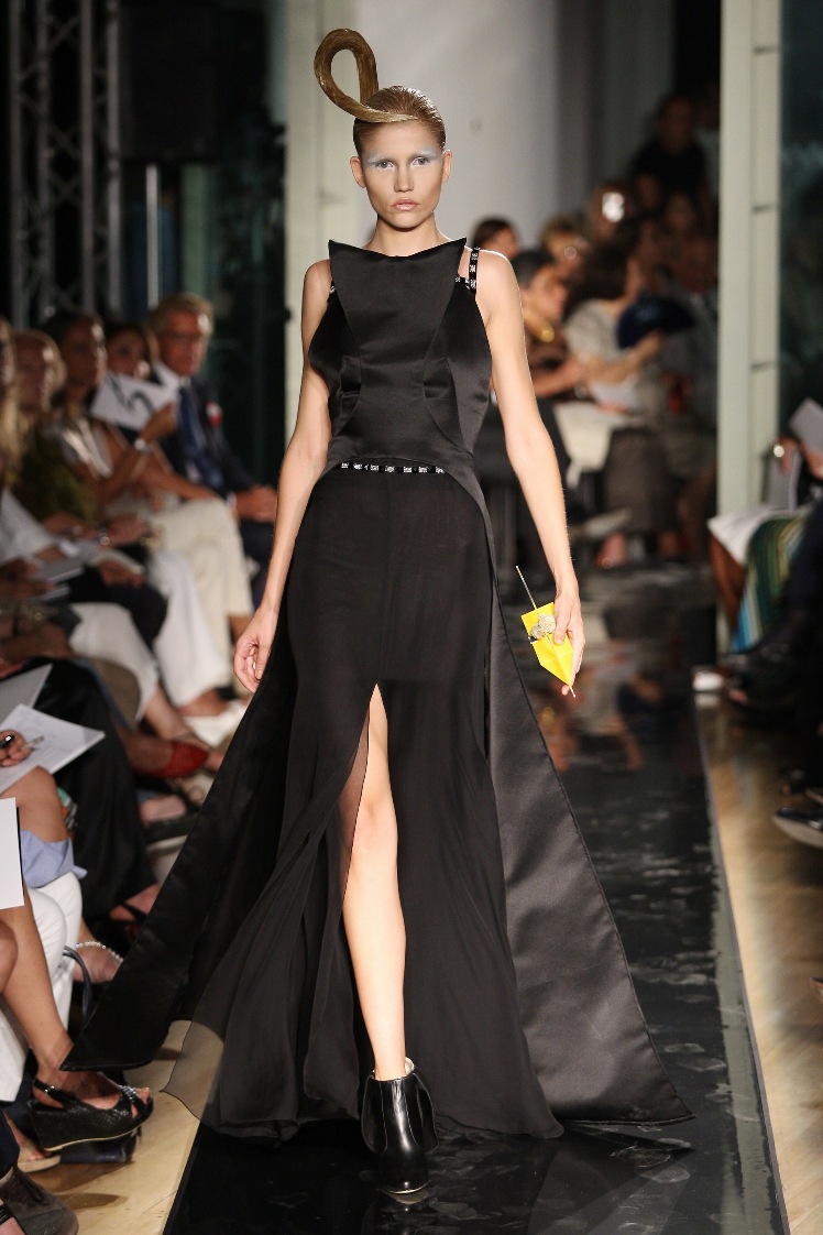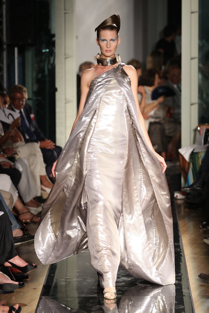 Lo spazio polifunzionale del museo MACRO Testaccio di Roma, ha ospitato giovedì 7 la presentazione della collezione di haute couture disegnata per l’Autunno-Inverno 2011/2012 da Guillermo Mariotto per Gattinoni. «Una dedica all’arte e agli artisti (“¦) – ha spiegato il direttore creativo della storica maison romana – Perché è proprio nei momenti di crisi che ci si rivolge allo spirito, alla religione, alla bellezza. E la creatività è appagante, gratificante, spesso persino compiacente». Le creazioni portate da Mariotto sulla passerella di AltaRoma, suggeriscono riflessioni estetiche contrastanti, raccontando diverse pulsioni che convivono nella vita e nell’arte. Alcuni abiti danno vita a costruzioni articolate, arricchite da volute e tornanti, linee esuberanti esasperano l’uso abituale delle stoffe e dei materiali, ricordando opere futuribili; altre creazioni come gli abiti-peplo, suggeriscono una riedizione fashion e contemporanea dell’arte classica e della statuaria antica. Immagini iconiche e visioni attinte dall’universo scultoreo di Tony Cragg, dai graffiti in 3D di Peeta, dalle foto e dagli ideogrammi di Roland Hicks, vogliono riaffermare l’importanza dell’arte della couture come espressione fondamentale dell’eccellenza italiana.