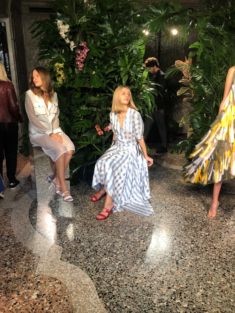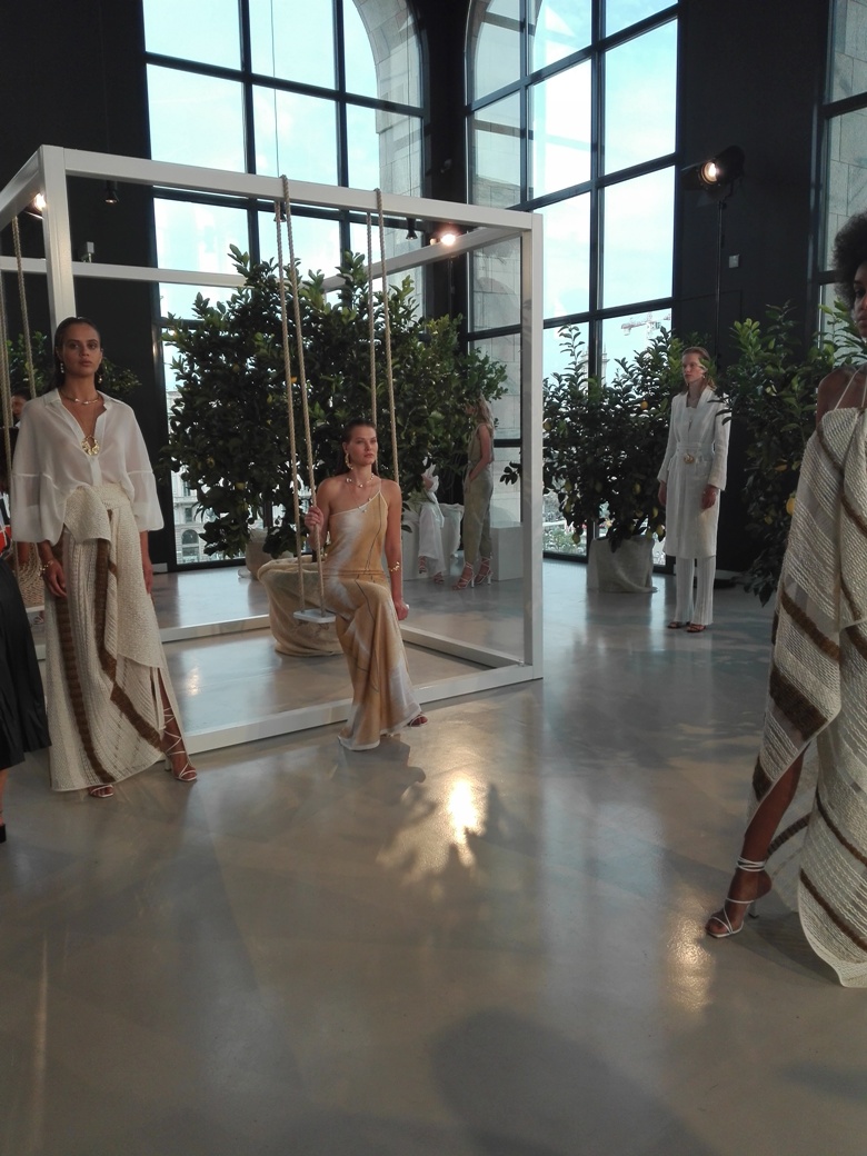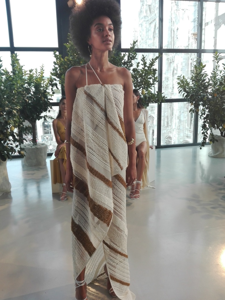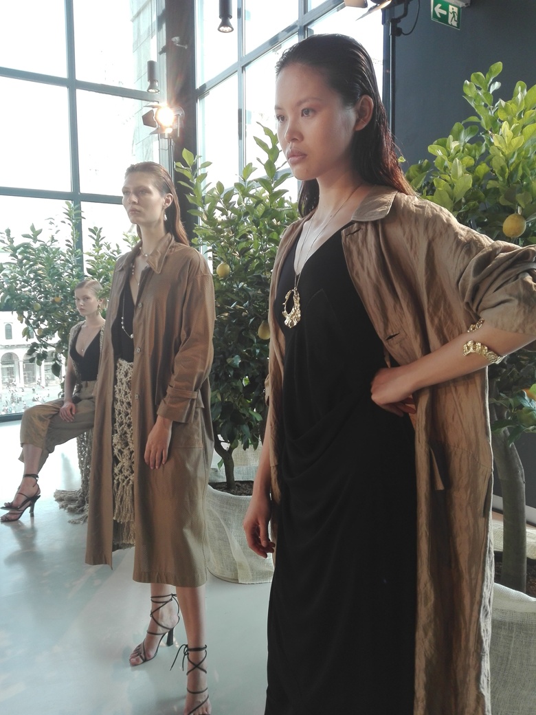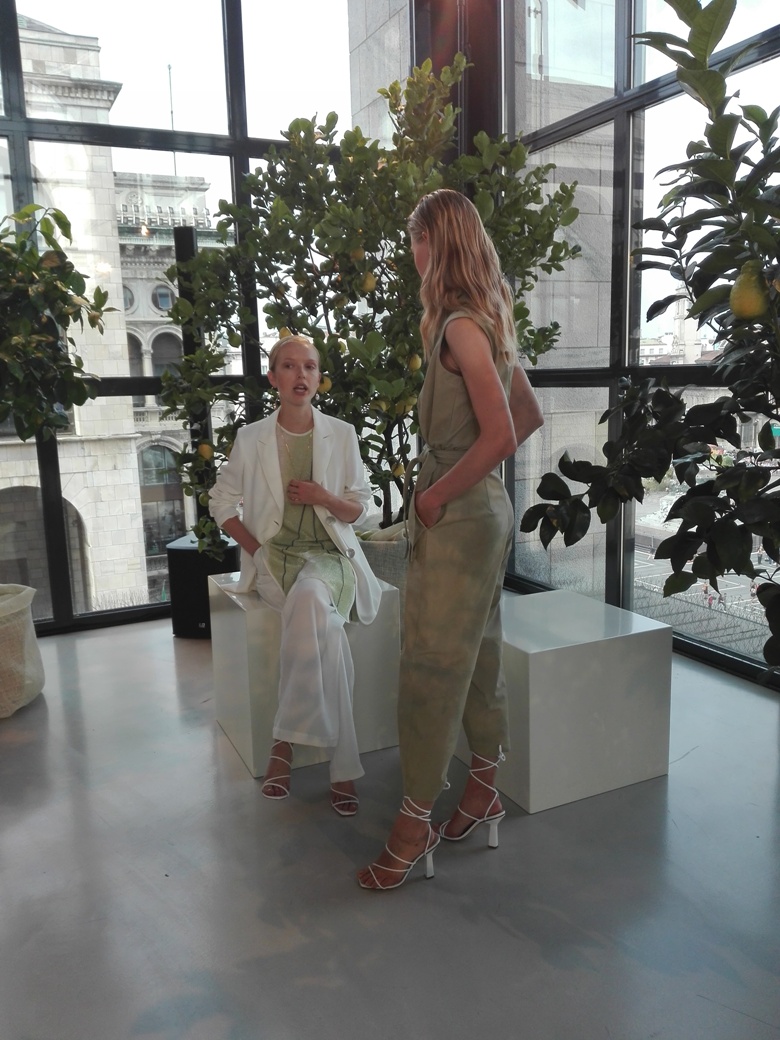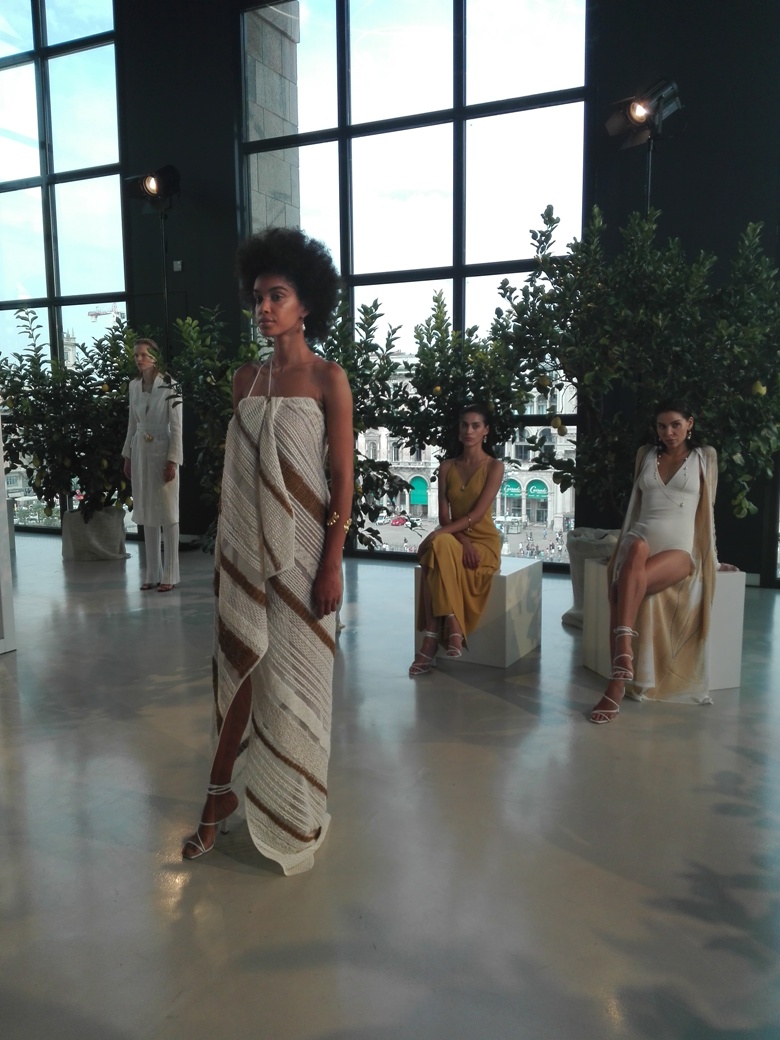Il mediterraneo accoglie gli ospiti di Gentryportofino, nel Museo del Novecento trasformato in una limonaia intensamente profumata -gli alberi sono cariche di frutti-. Tutto richiama le coste della Liguria lì dove Portofino, il piccolo borgo di pescatori famoso nel mondo, si affaccia su una baia con le sue case, i suoi negozi esclusivi, i ristoranti dove gustare specialità di pesce, il Castello in alto, la piazzetta da cui ammirare le case colorate che si riflettono nel mare. In Liguria affonda le sue radici il marchio produttore -agli albori- di cachemire; poi si sposta nel mantovano quando il brand è rilevato dalla Olmar and Mirta di Giambattista Tirelli alla fine 2011. Dopo diversi anni di consolidamento, si presenta a Milano per la stagione A/I 2019-20 (cfr. Autunno chiama , si presenta ora per la sua seconda prova, P/E 2020 a MFW.