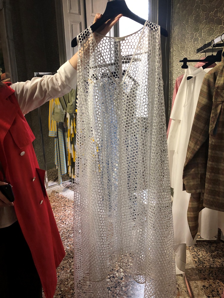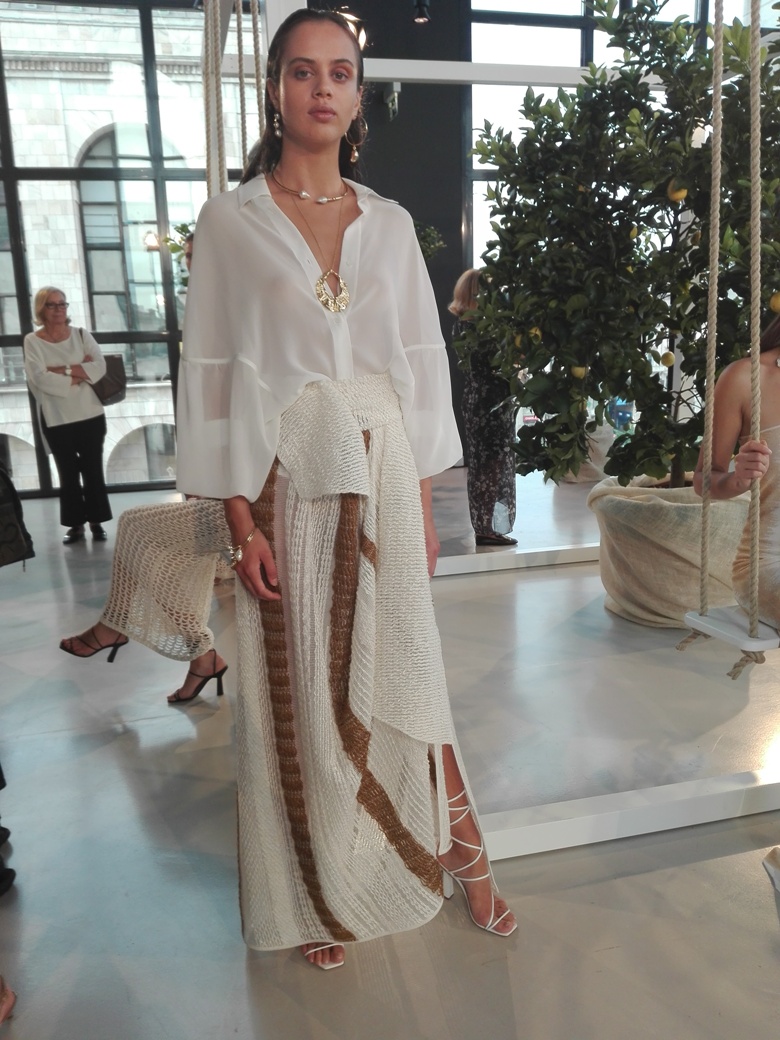 Tessuti puri, seta e cotoni, sono mescolati a frange, check,e disegni classici maschili come il gessato; a cui si aggiunge la rete da pesca ripensata in filati di lusso per i capi più seducenti e alla moda.