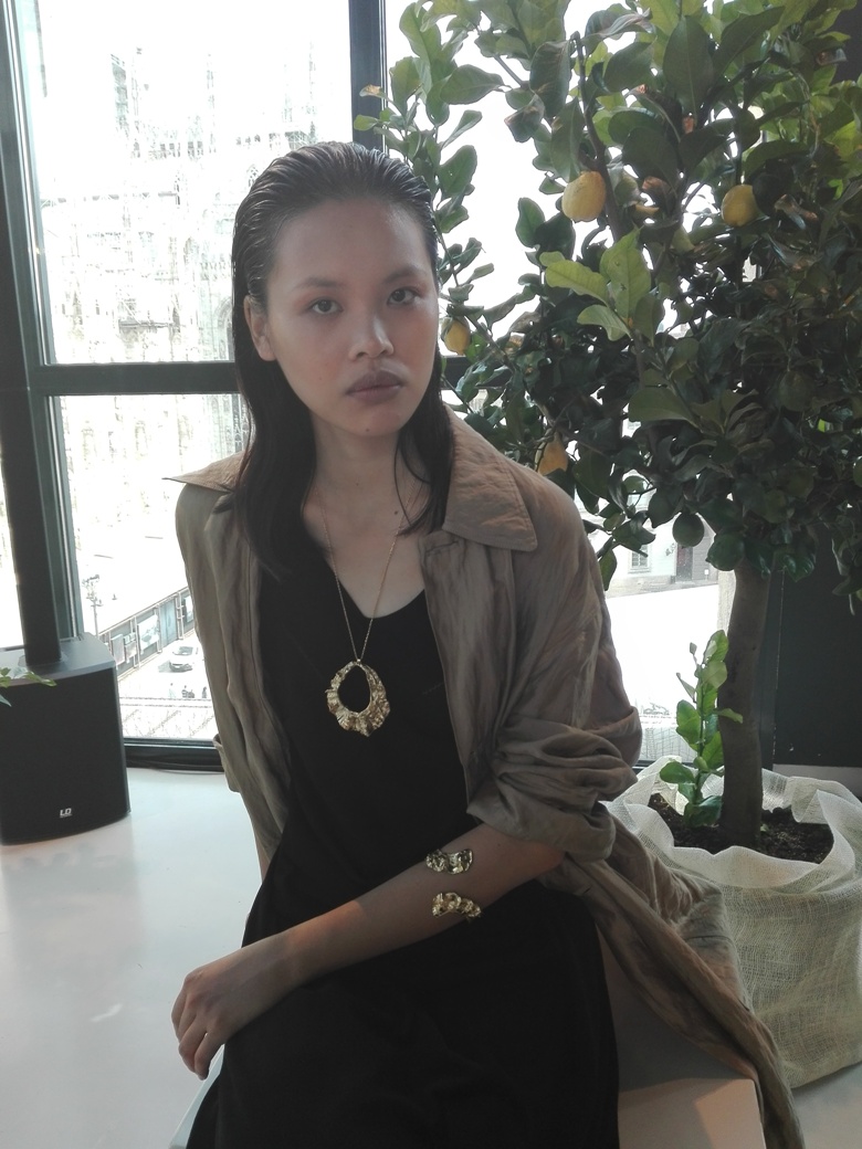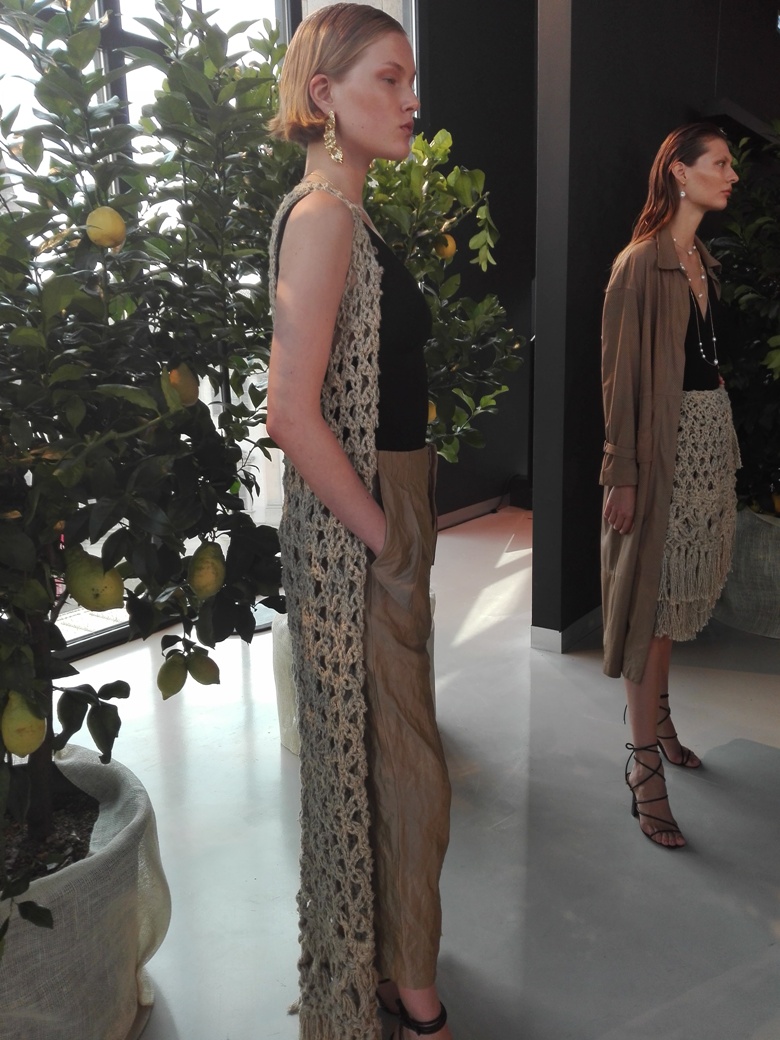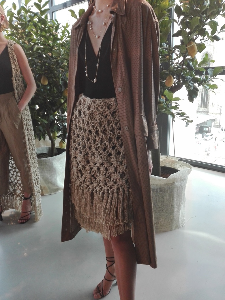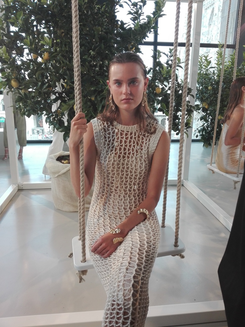 Portofino può ben essere il riferimento della collezione che appunto si svolge in un clima mediterraneo fatto di limoni e di richiami marittimi: le reti da pesca sembrano aver trovato il loro più elegante utilizzo nelle tuniche e macro maglie. Limitata la paletta che si muove tra i colori bianco, ocre, salvia, e i toni bruciati per gli abiti, che mantengono il clima mediterraneo e raffinato delle creazioni. I gioielli -collane, orecchini, bracciali-, ricordano le conchiglie e i colori delle pietre del mare e concorrono a riprodurre un clima marinaro, sereno e appagante come il mediterraneo ligure.