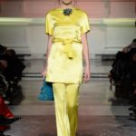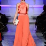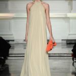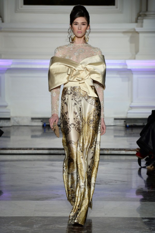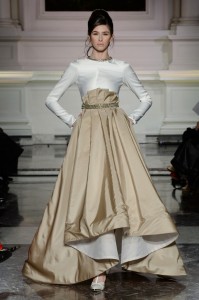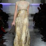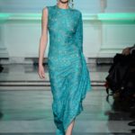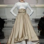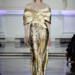 Must have della collezione sono le cappe e i pantaloni che slanciano la figura attraverso un gioco di ampiezze, ricami, di catene cangianti che ricordano il colore delle rocce bagnate dall’acqua. I volumi degli abiti sono coerenti con le caratteristiche dei tessuti prescelti, le gonne sono morbide e scivolate, fa eccezione la gonna lunga color sabbia, con pieghe che partono dalla vita alta, più strutturata e con taglio a trapezio, sicuramente pensata per una serata di gala.