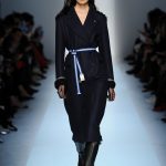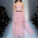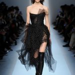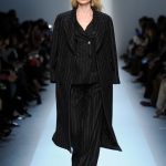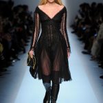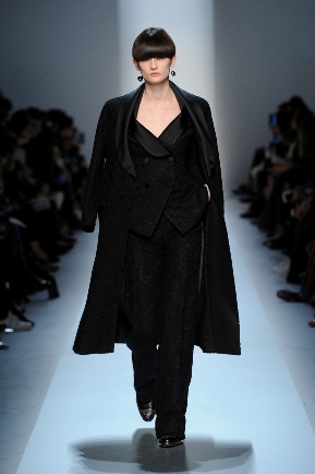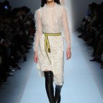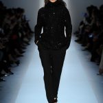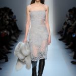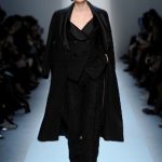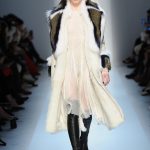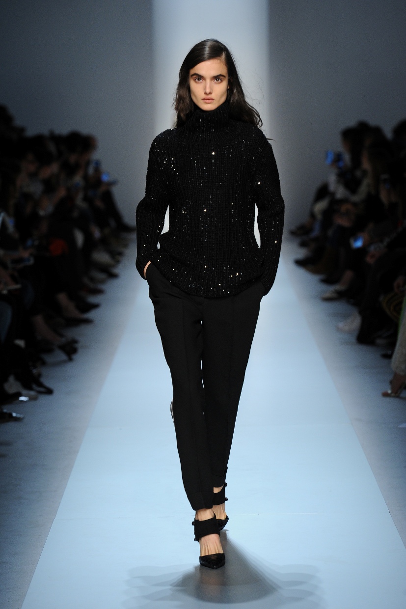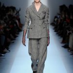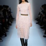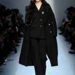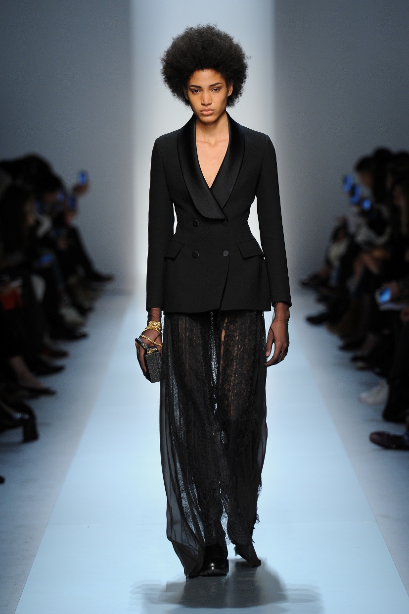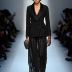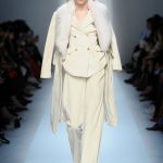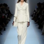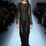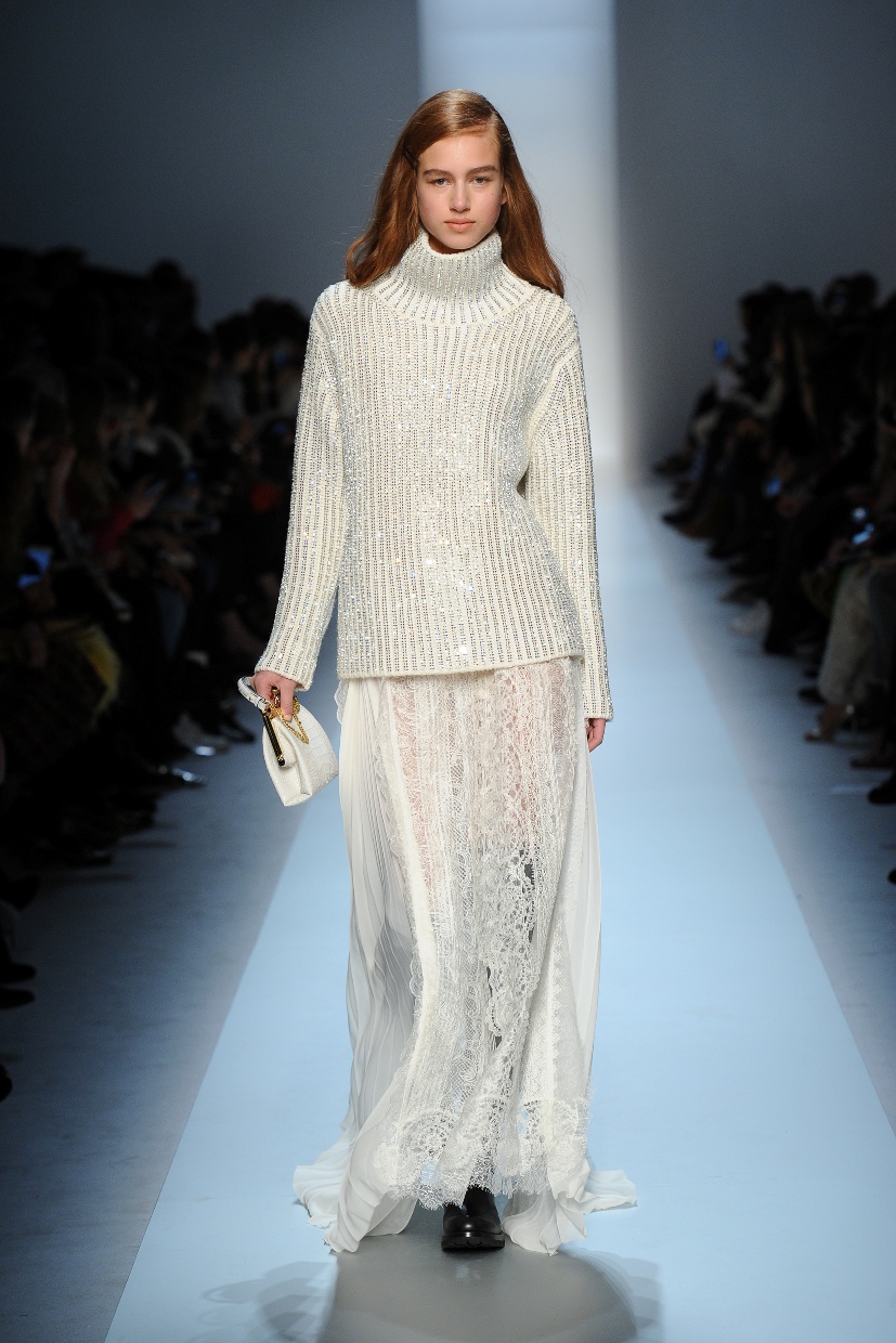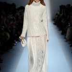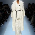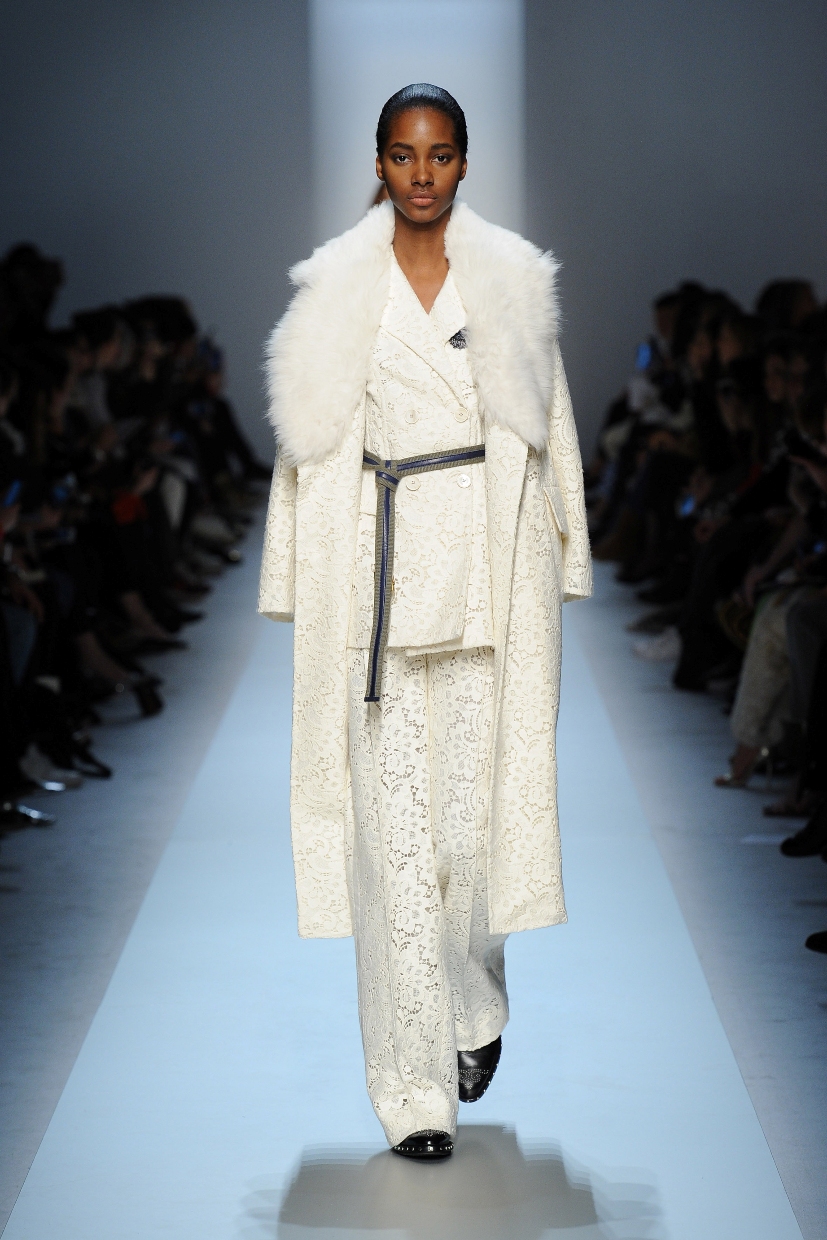 Alcuni accostamenti ci sono sembrai non ben riusciti, come l’insieme di macramè e pizzo valencienne; decisamente di scarso risultato l’abito in pizzo ricoperto di piccole rouches di tulle a coprire il seno e i fianchi e quello in plumetis su organza. Ciò non toglie valore alcuni di questi capi; come il tailleur pantalone nero in pizzo macramè, giacca doppio petto con revers effetto smoking che si ripetono sul cappotto sempre il pizzo nero; macramè bianco in un completo simile dove il collo del cappotto è in pelliccia. Belle anche le maglie luminose, come il maglione bianco dal collo alto indossato su una lunga gonna di organza e pizzo e quello nero su pantalone nero.