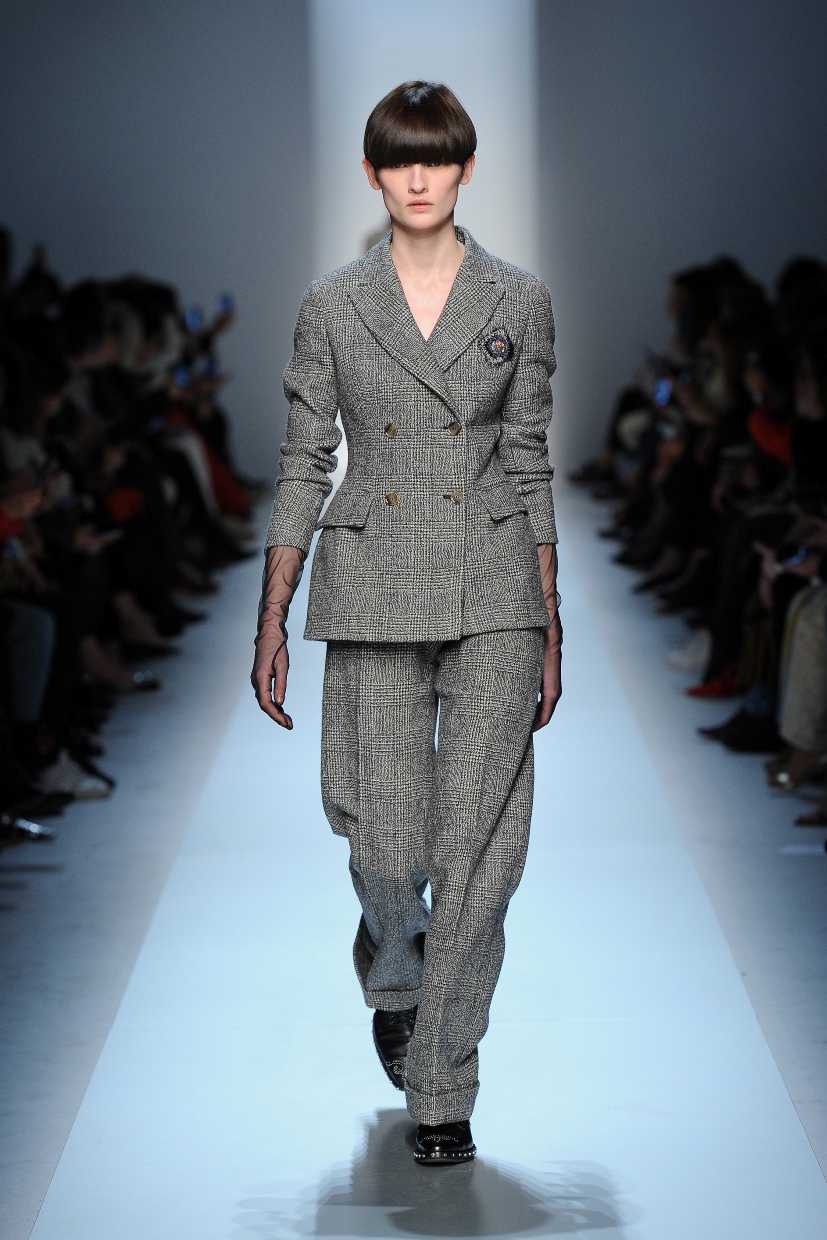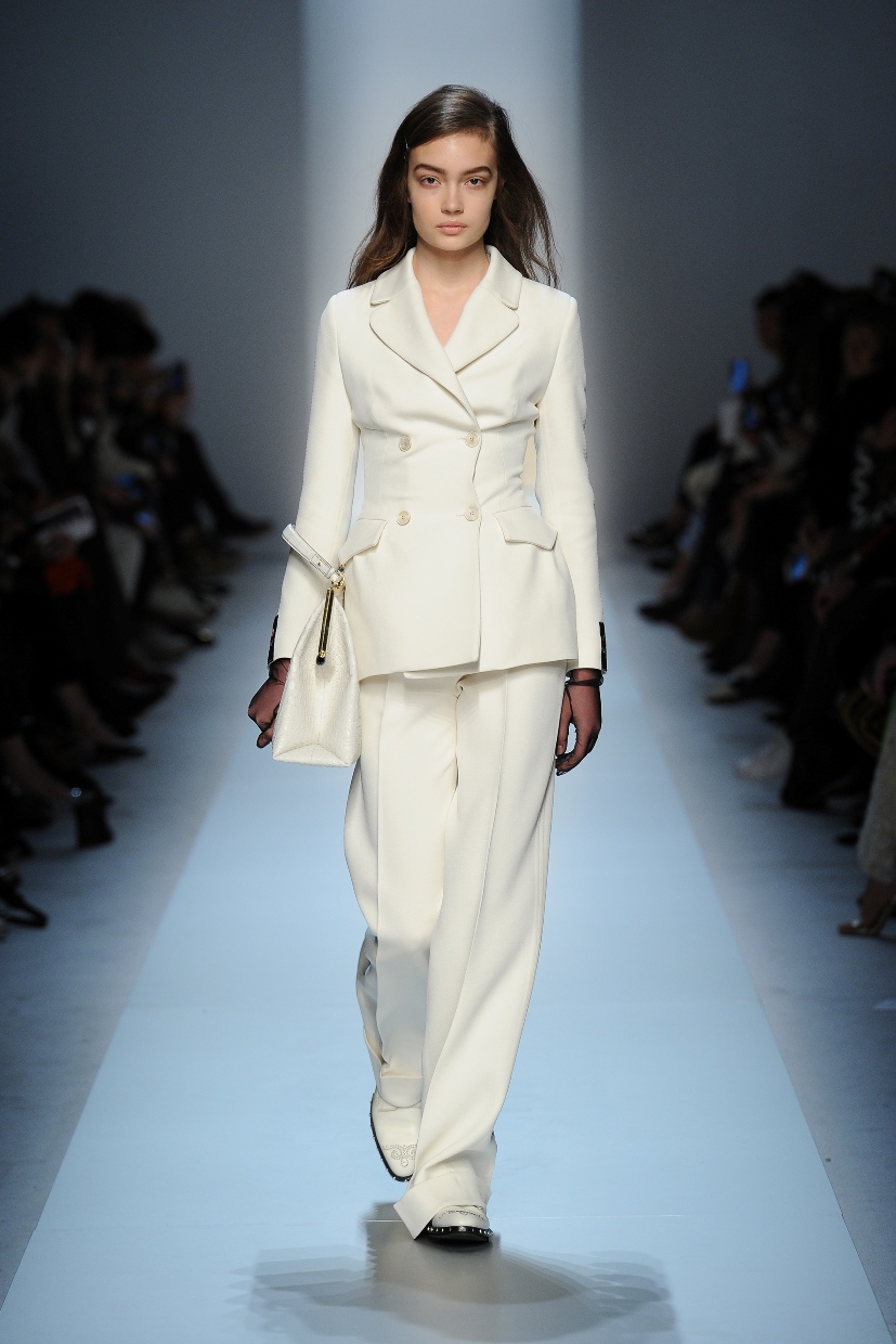 Il tailleur pantalone molto morbido è il capo must have della collezione; la giacca è sempre un doppio petto sagomato, con il punto vita ben segnato; il tessuto è un principe di Galles, rilavorato e alleggerito con fili di lino, o un velluto a macro coste oppure macramè nei capi più importanti.