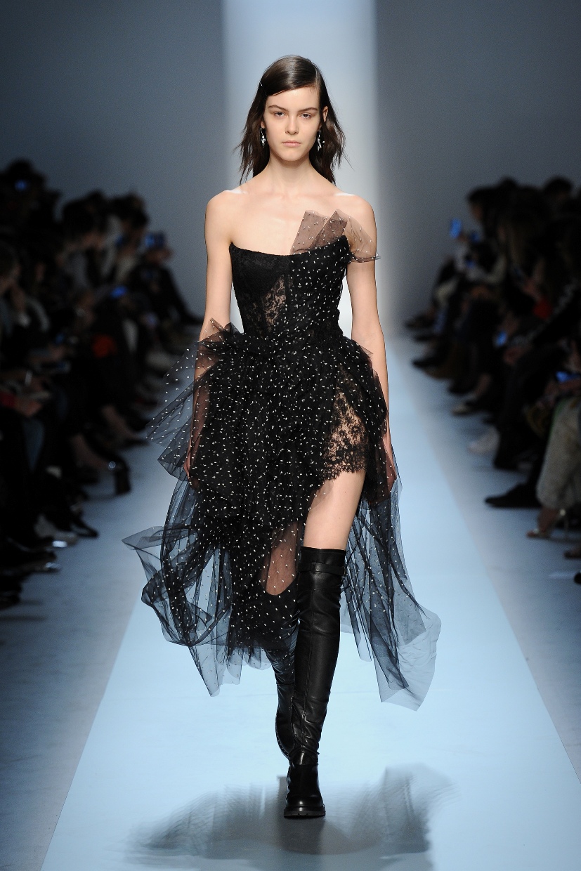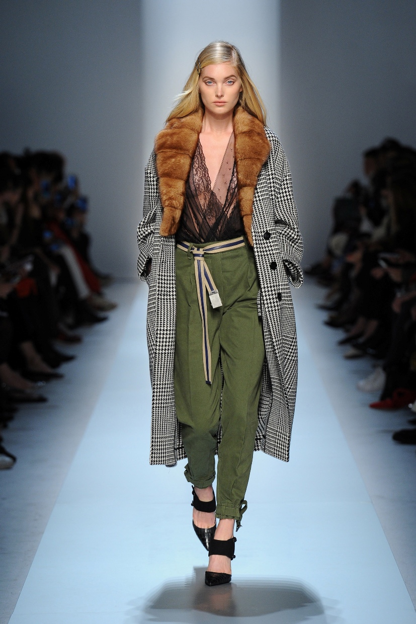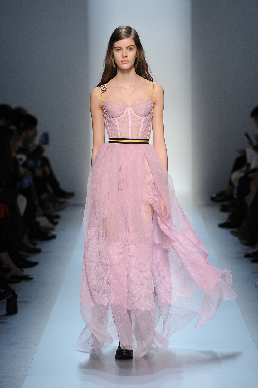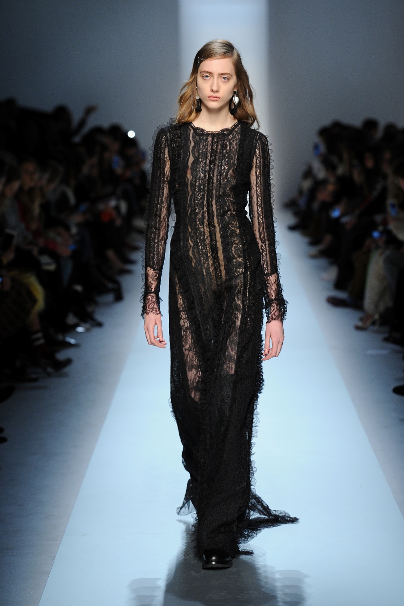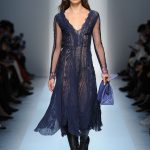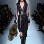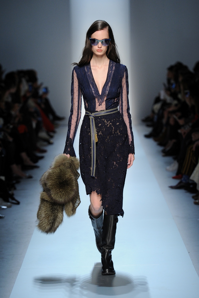Si è militarizzata la donna romantica e sensuale di Ermanno Scervino. Il meglio della collezione A/I 2017-18 portata MMD di febbraio 2017, è proprio rappresentata dai capi da giorno più determinati e rigorosi. Deludenti invece i capi da sera quelli in pizzo o plissè e gli abiti bustier; forse perché indossati con stivali, i cuissard, alti sopra il ginocchio, le cinture sottili bicolore e specialmente il fatto di abbinarli a un parka o a un biker in pelle, toglie glamour alla mise. Nell’insieme, pur nella preziosità dei pizzi, sono risultati di scarso impatto.