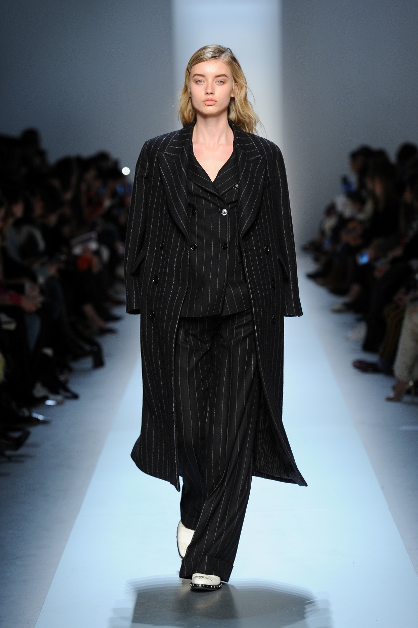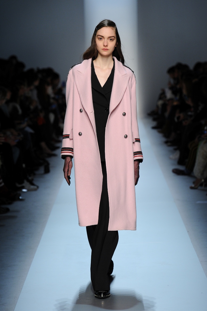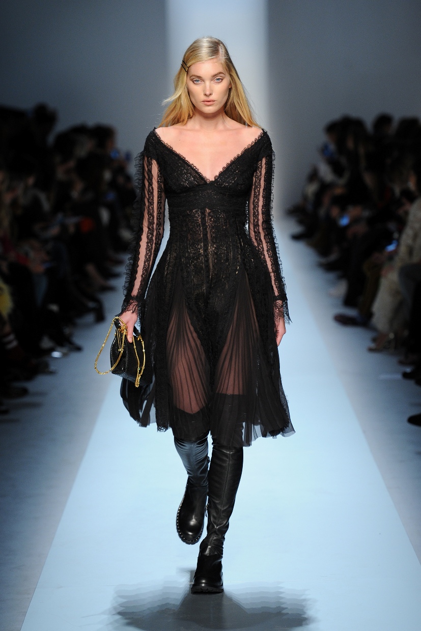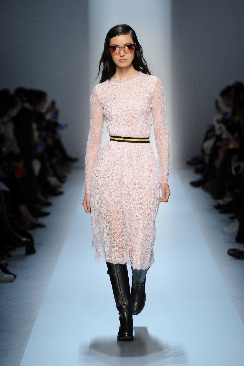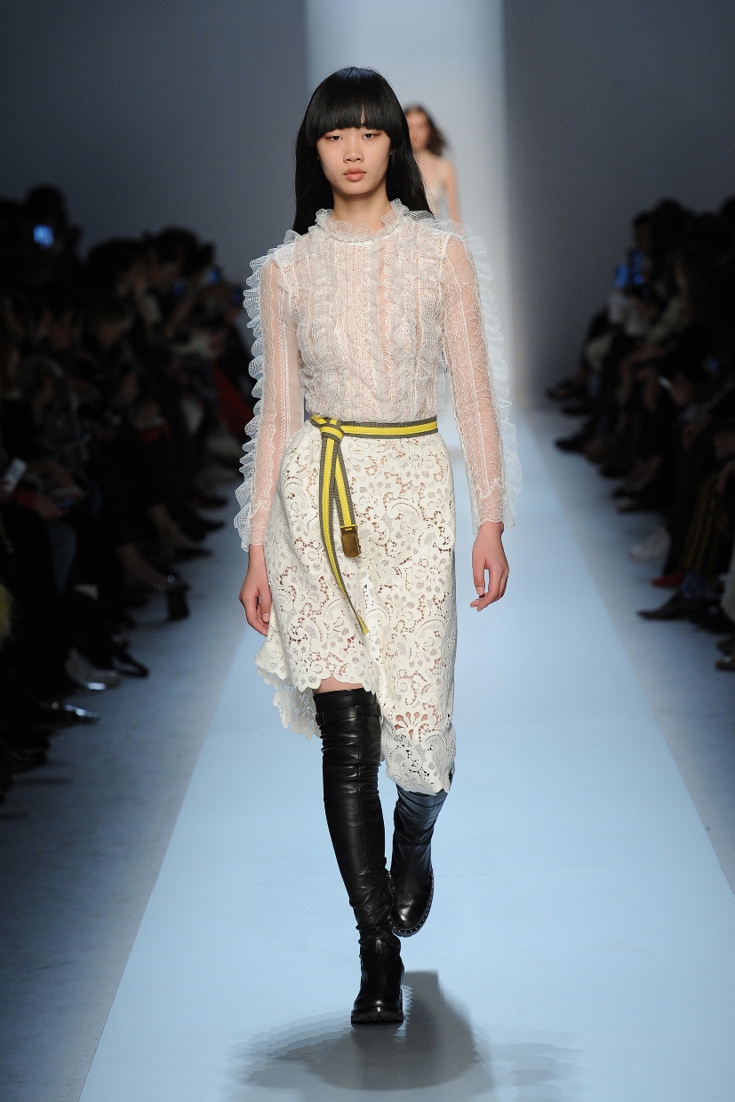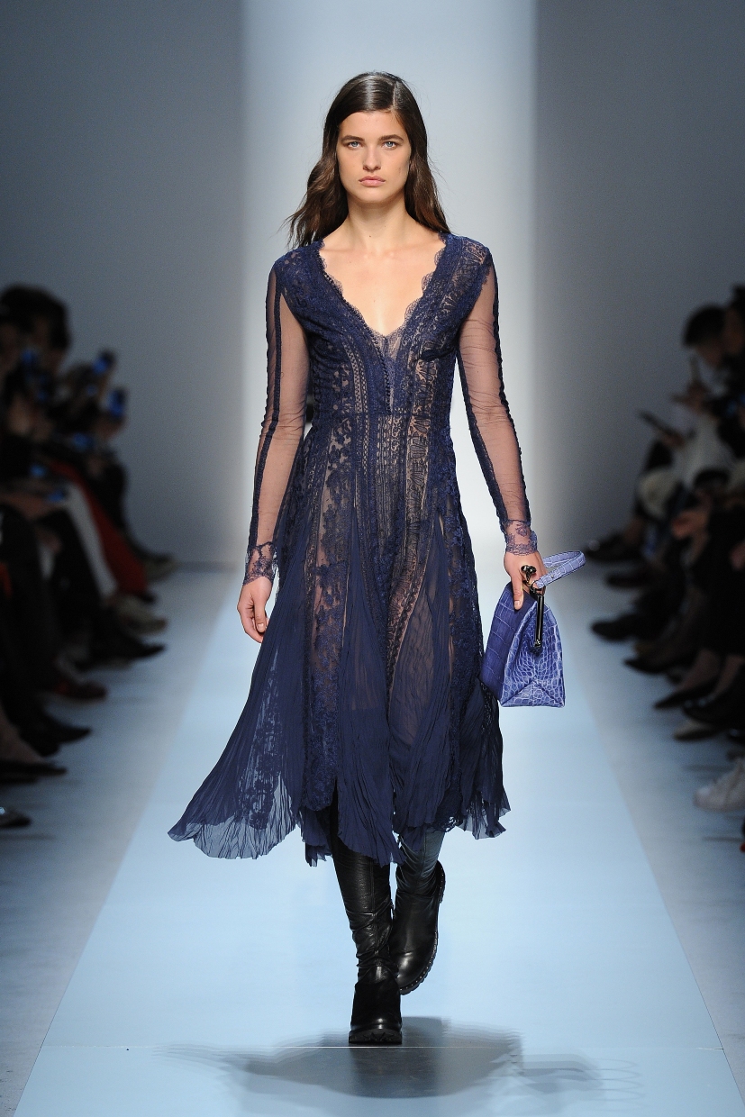 Si è militarizzata la donna romantica e sensuale di Ermanno Scervino. Il meglio della collezione A/I 2017-18 portata MMD di febbraio 2017, è proprio rappresentata dai capi da giorno più determinati e rigorosi. Deludenti invece i capi da sera quelli in pizzo o plissè e gli abiti bustier; forse perché indossati con stivali, i cuissard, alti sopra il ginocchio, le cinture sottili bicolore e specialmente il fatto di abbinarli a un parka o a un biker in pelle, toglie glamour alla mise. Nell’insieme, pur nella preziosità dei pizzi, sono risultati di scarso impatto.