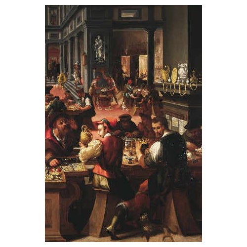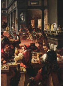 Passiamo poi ad un curioso dipinto, “La bottega dell’orefice”, di Alessandro Fei, detto il Barbiere (seconda metà del 1500), che mette in primo piano un compito artefice con davanti a sé un vassoio pieno di anelli di varia foggia e composizione.