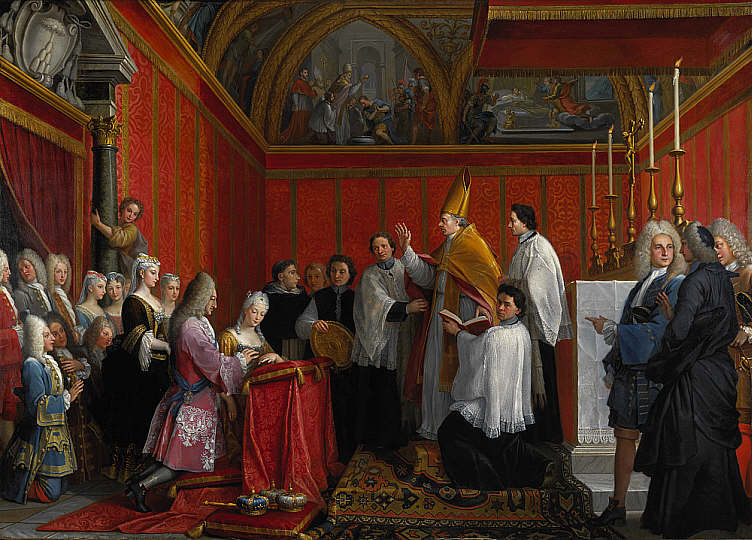 Interessante è poi la tela di Agostino Masucci (1719) che riproduce le “Nozze del Pretendente” – inteso come Giacomo Start, aspirante al trono d’Inghilterra – con la nobile polacca Maria Clementina Sobieska, che indossa un antico e prezioso anello di diamanti (già portato da Maria I d’Este).