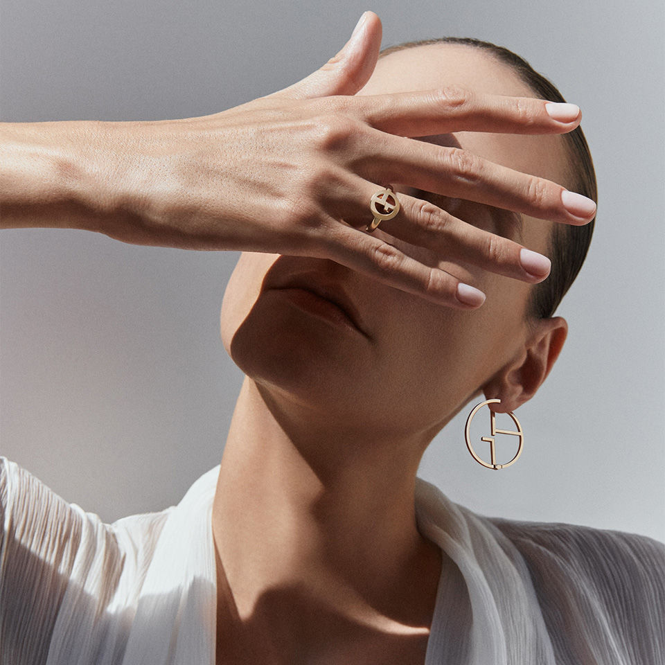 Infine, Firmamento, attraverso i bagliori di pavé e diamanti di taglio brillante, rievoca il lucore degli astri nel cielo notturno, tema ricorrente nell’immaginario e nelle collezioni moda di Giorgio Armani. Stelle e falci di luna, dal tratto stilizzato, diventano anelli, bracciali, orecchini e collane in oro bianco, arricchiti talvolta di inserti e frange.E dopo il mitico greige degli abiti, ecco l’oro Nuance Giorgio Armani. In tutte le parure in oro, infatti, troviamo una delicata sfumatura cipriata che dona pacatezza ed eleganza ad ogni monile, diventandone la cifra stilistica.