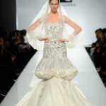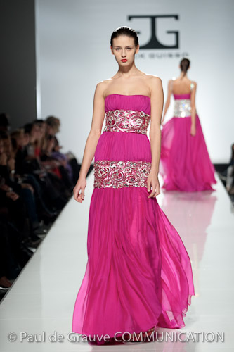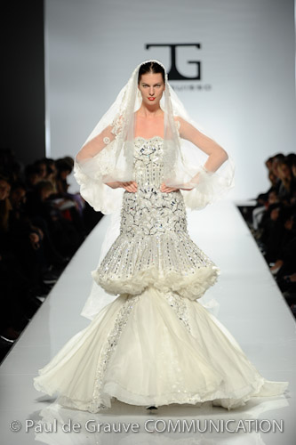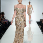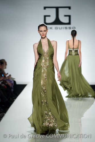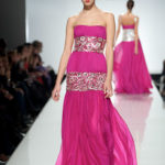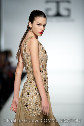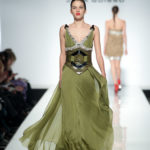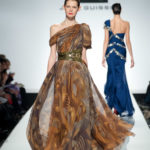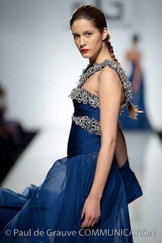 Lo stilista è per la prima volta sulle passerelle di Roma e certamente ha voluto lasciare il segno. Una collezione da gran sera, opulenta, dal gusto orientale. I colori sono accesi fucsia e blu oceano, non mancano i anche i pastello e il verde oliva e il cannella che si susseguono ordinamente sulla passerella, i modelli spesso sono ripetitivi. La silhouette è molto femminile, leggera ma l’abito è appesantito dall’uso esagerato di pietre e cristalli formando spirali decisamente ridondanti che tolgono leggerezza ai tessuti di per se evanescenti. Dove non ci sono applicazioni la fantasia è libera di esprimersi e di dare leggiadria all’abito. A fare da leitmotiv della collezione tre temi ricorrenti: le calzature rigorosamente rosse, le cinture assolutamente alte e del medesimo colore e gli utensili industriali usati come decoro. La ridondanza tipica della collezione si esprime al massimo negli abiti da sposa che appaiono decisamente “carichi”.
