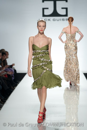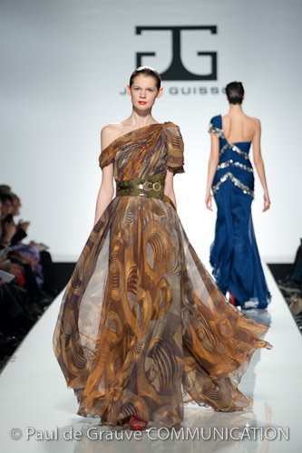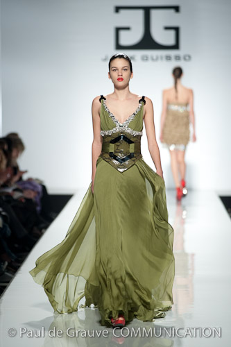 Leggiamo la cartella stampa per Jack Guisso e rimaniamo perplesse. Sembra impossibile, ma da ciò che è scritto non riusciamo a comprendere se il commento si riferisce alla sfilata a cui dobbiamo assistere o alla precedente: evidentemente è una affrettata traduzione e nessuna persona di madre lingua italiana la ha esaminata prima di stamparla.