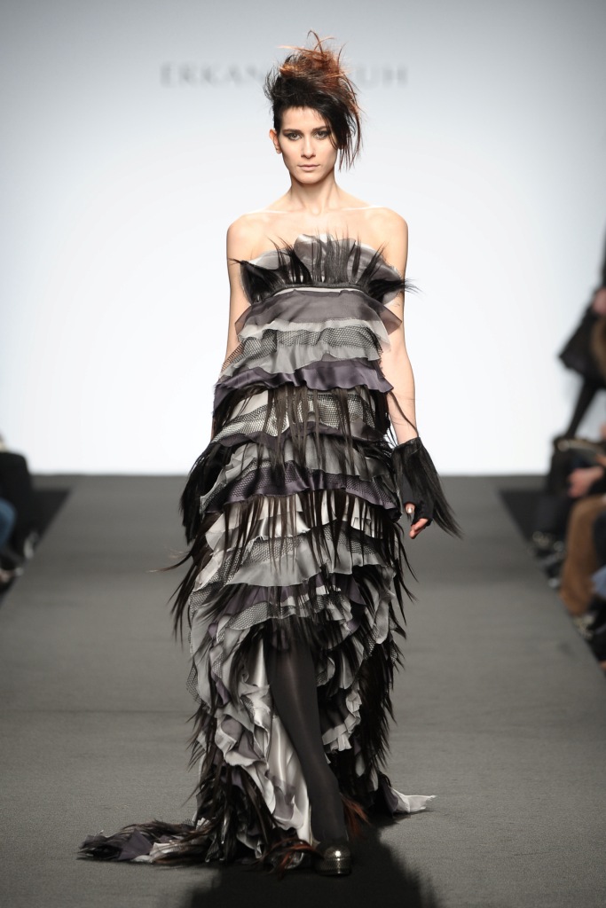 Altro stile per Erkan Coruh designer turco vincitore dell’ultima edizione di Who’s on next: una collezione dove prevale la voglia di stupire con abbinamenti bizzarri: inserti di criniere di cavalli, di cappelli posticci che spuntano dappertutto rendendo fastidiosa la sequenza degli abiti e poco credibile il lavoro dello stilista per una passerella di Altamoda. La cartella stampa ci dice che lo stilista ha pensato ad una armata di guerriere eccentriche che “con un’animo nevrotico saranno pronte per la battaglia, per proteggere la creatività e soprattutto l’anima del marchio Erkan Coruh”.