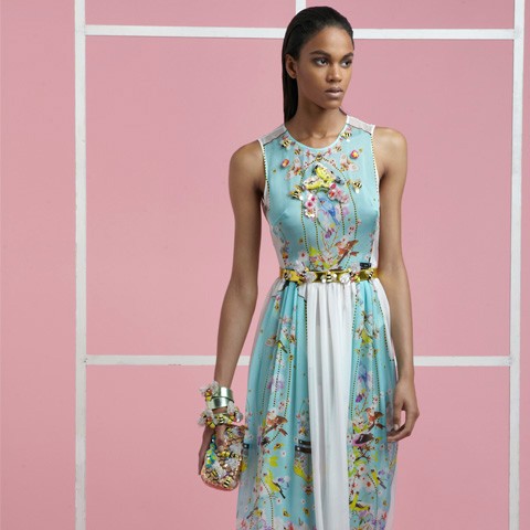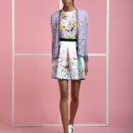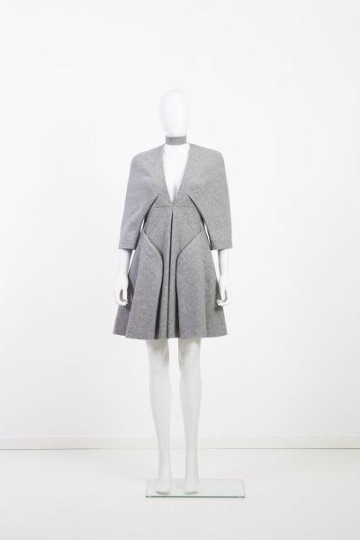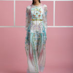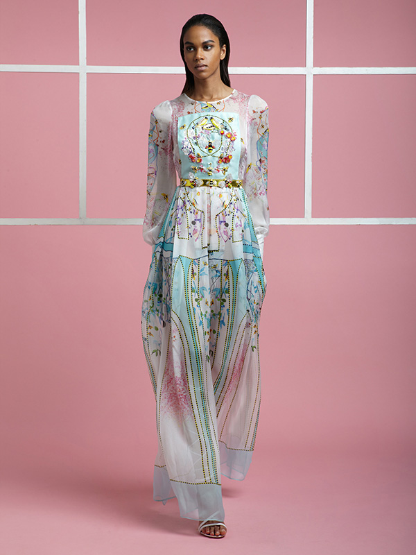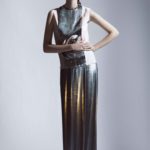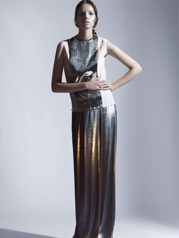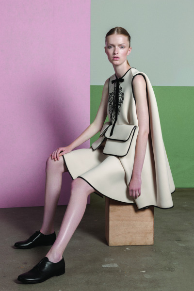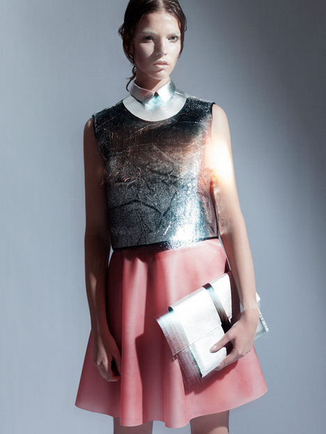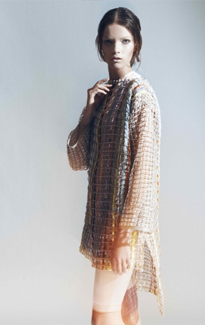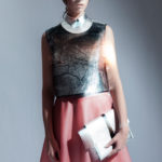 In effetti Ravn è da sempre un paladino del concetto di “slow fashion” alla base del fatto a mano, che nelle sue collezioni si concretizza in un ossimorico “massimalismo minimalista”, giocato su forme delicate, uso di tagli intricati e molti dettagli, nel tentativo di rendere scultoree forme all’apparenza lineari. Nelle sue creazioni ci colpiscono soprattutto i delicati motivi a pergamena, i grembiuli-tabarro e le spalle scolpite, dove dominano color nude e argento, attinti dalle pagine di un libro sulle armature medievali (che egli ha casualmente trovato a Vienna). Ne è sortita un’intrigante linea di lingerie portata sotto imbracature in velluto che richiamano le geometrie delle vetrate gotiche in vetro policromo, e poi una cotta di maglia rivisitata con un soffice maglione intrecciato a fili multicolor. La sua interpretazione ludica di un tema piuttosto serio si fa dolcemente futuristica se abbinata a pochette porta-iPad e creepers argento alte 10 centimetri, create in collaborazione con la griffe inglese Underground Shoes. Anche il look che ha ideato per Chloé merita una citazione: un cocktail dress in rete corallo con gonna a palloncino, indossato sotto un blouson in neoprene con spalle scese, un outfit very chic.