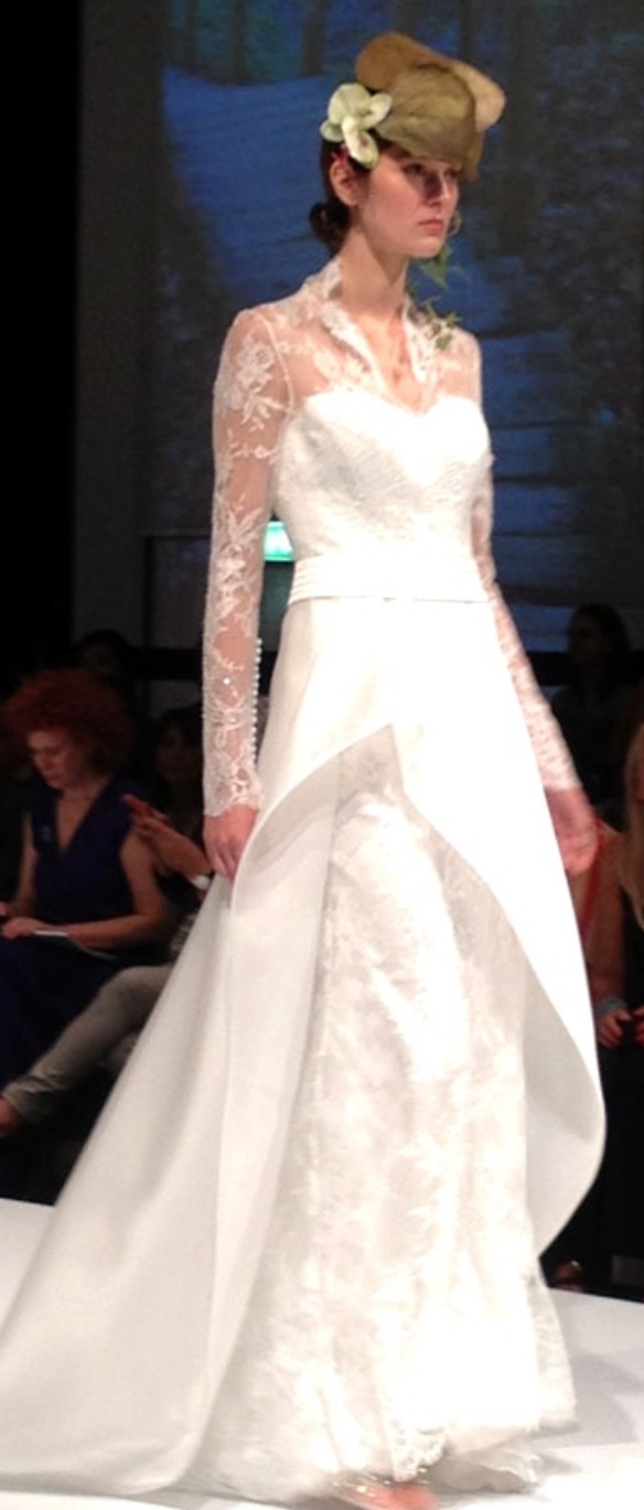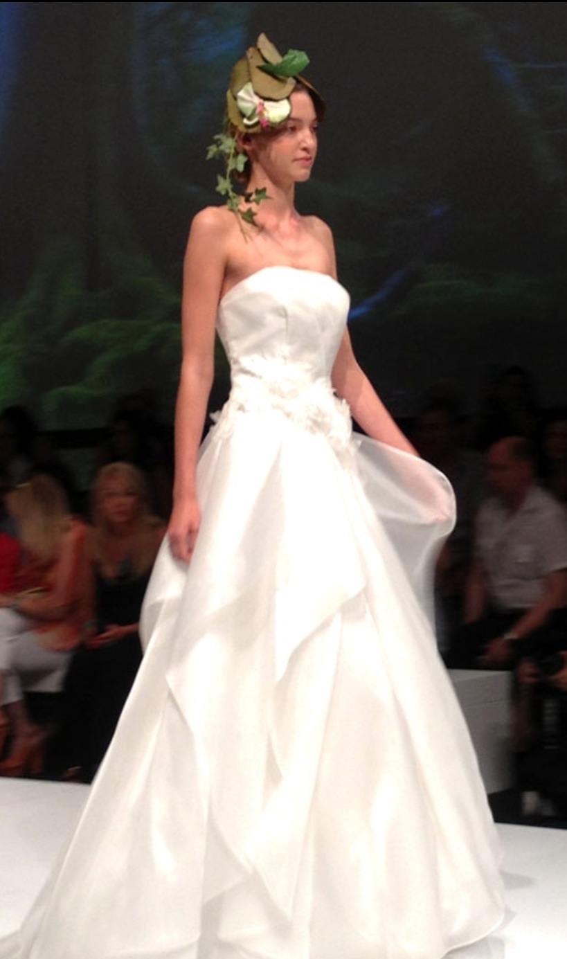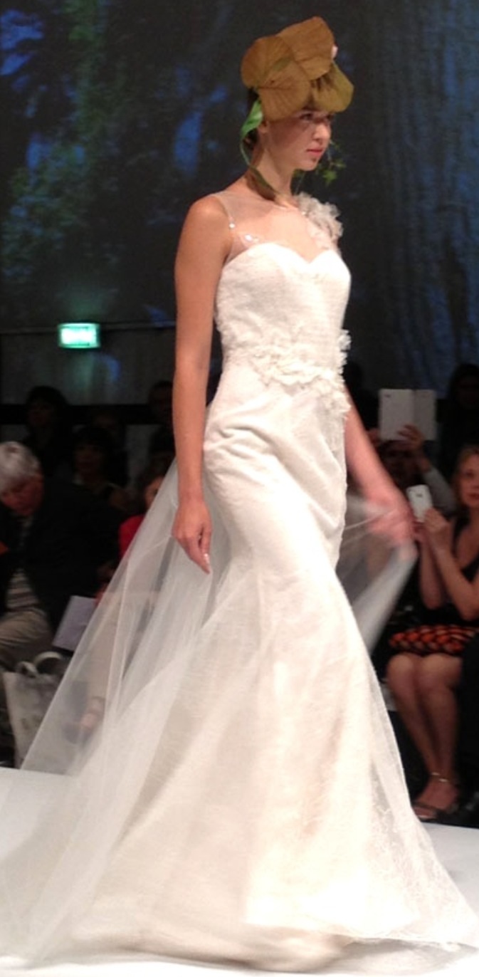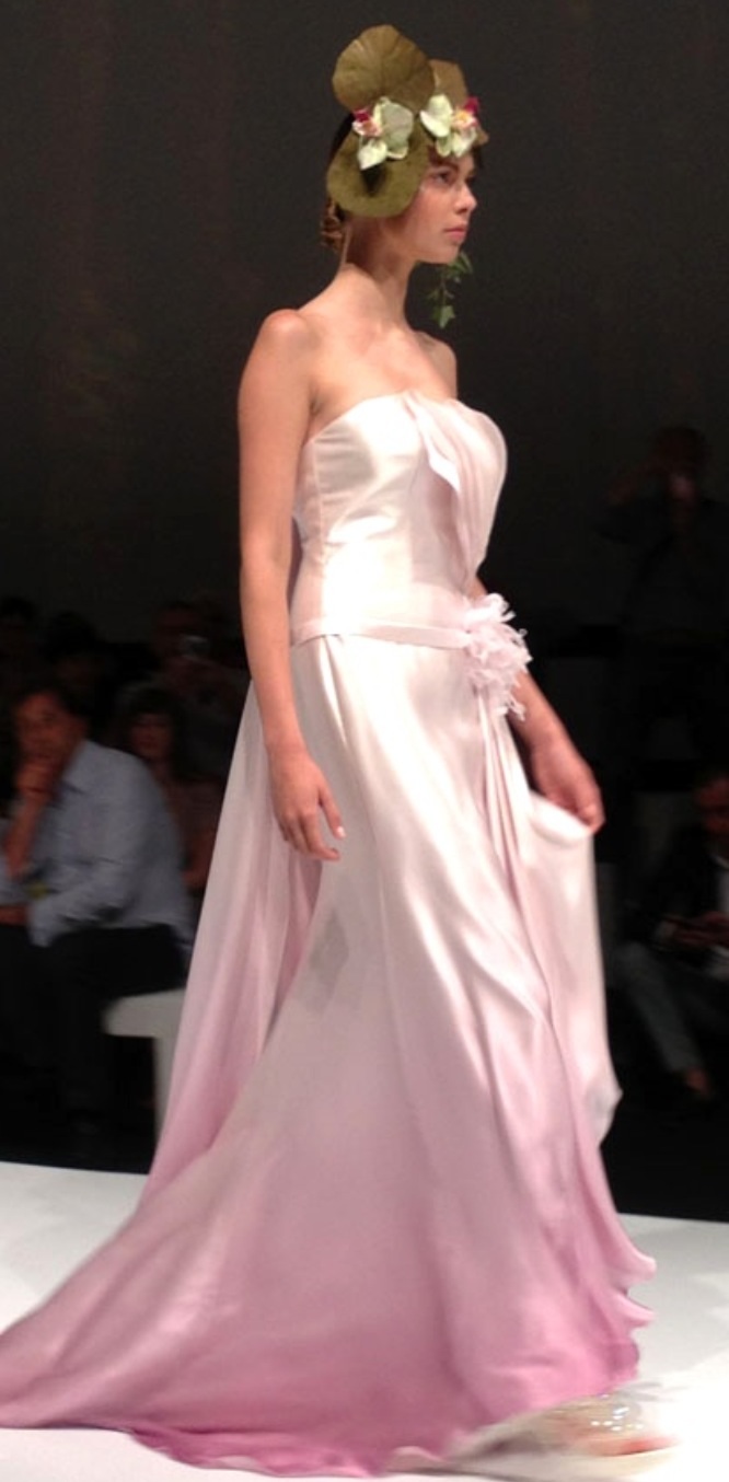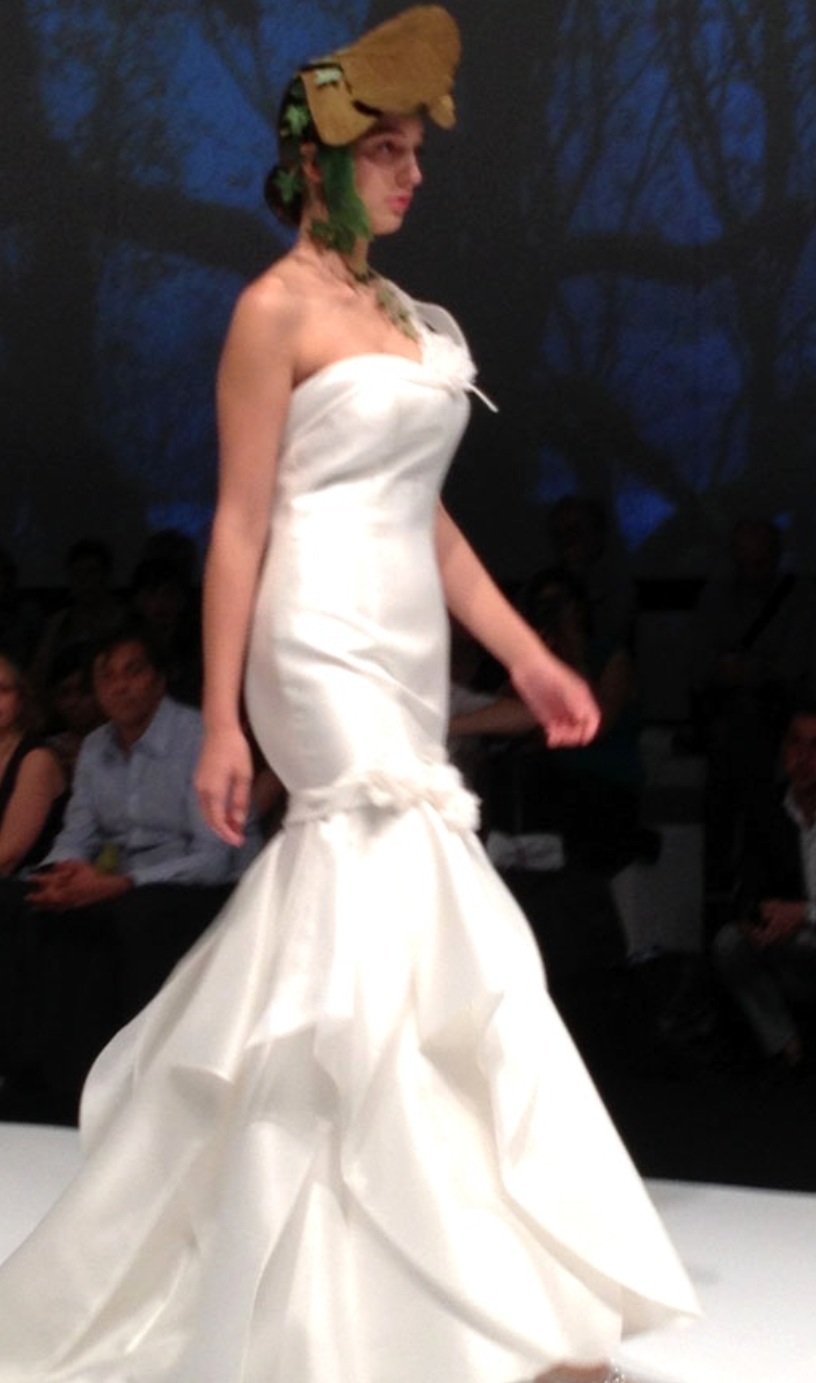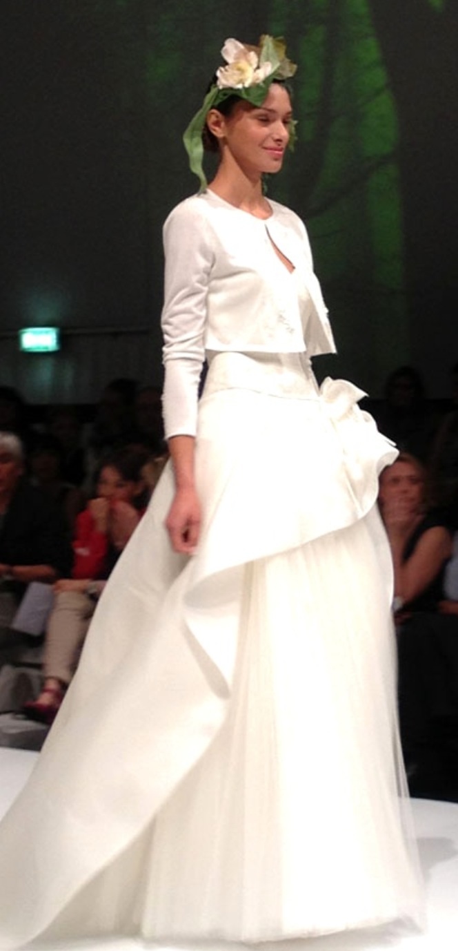 Indossando un simpatico cerchietto verde e marrone in stile fatine –come a personificare le spose di tutte le stagioni- sembrano arrivare dal mondo dei boschi: romantiche sì, ma determinate. Donne appassionate e sognatrici che sanno però ciò che vogliono per essere felici, questo sembra essere il messaggio conclusivo trasmesso anche dal monologo corporeo dell’artista sulla passerella a ritmo di musica a fine sfilata.