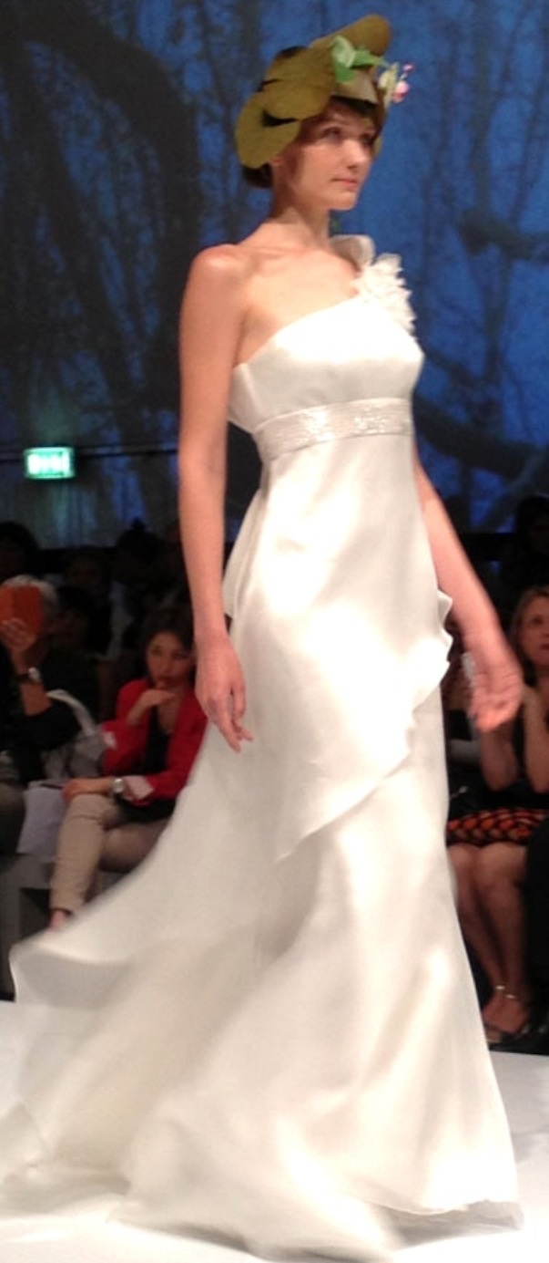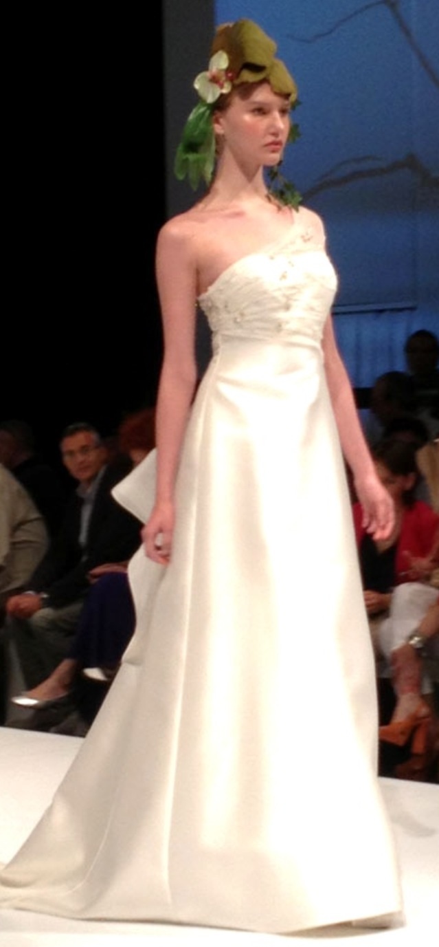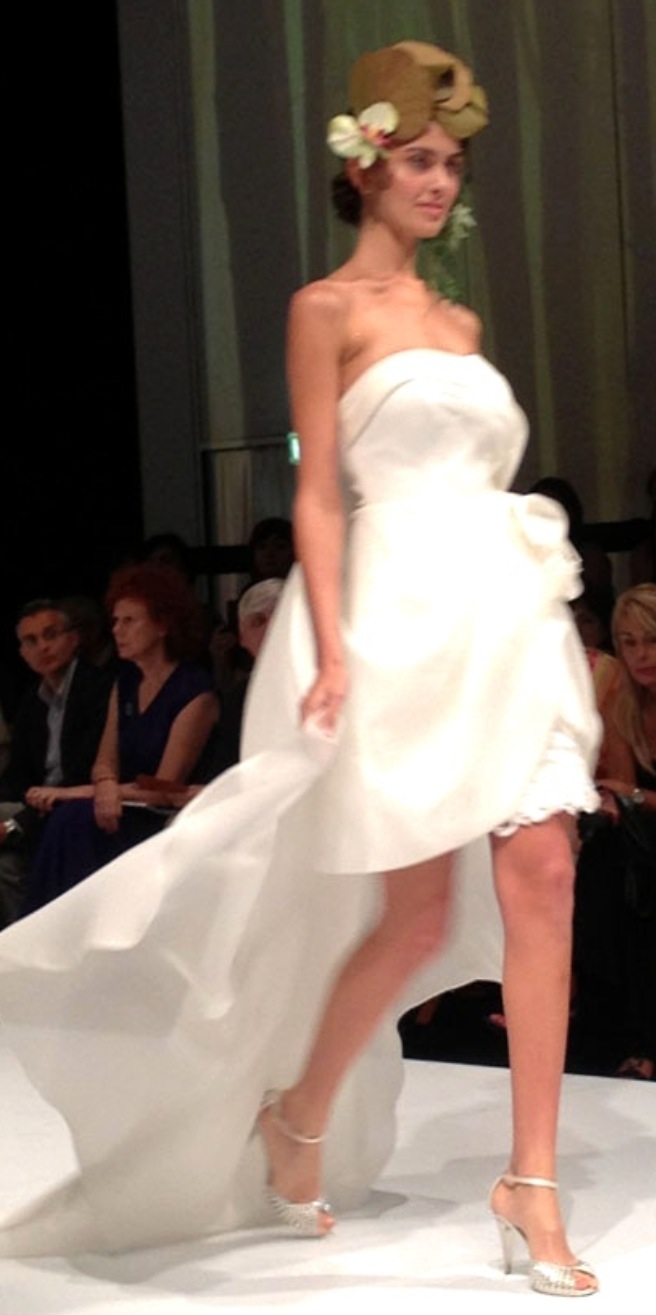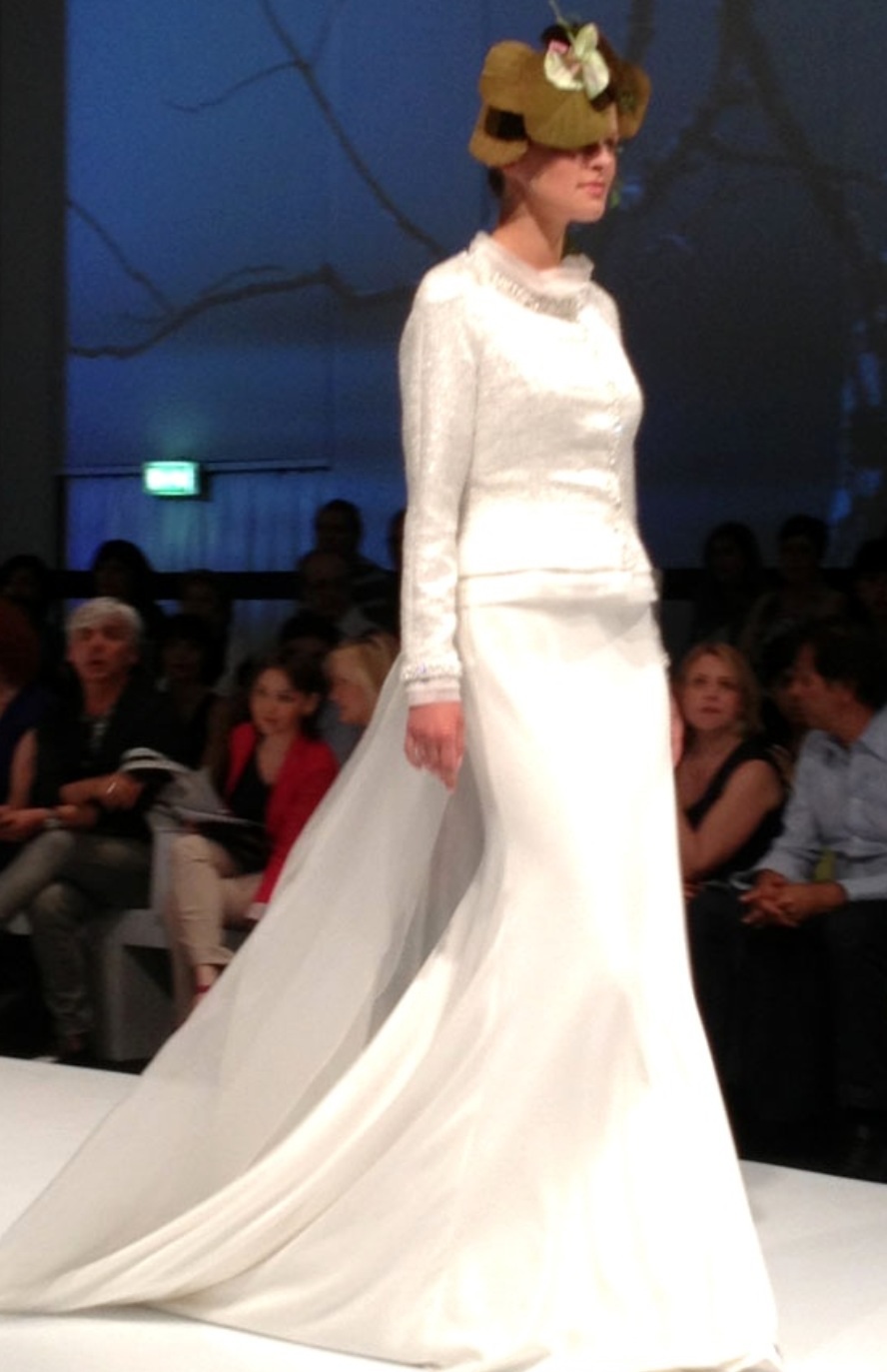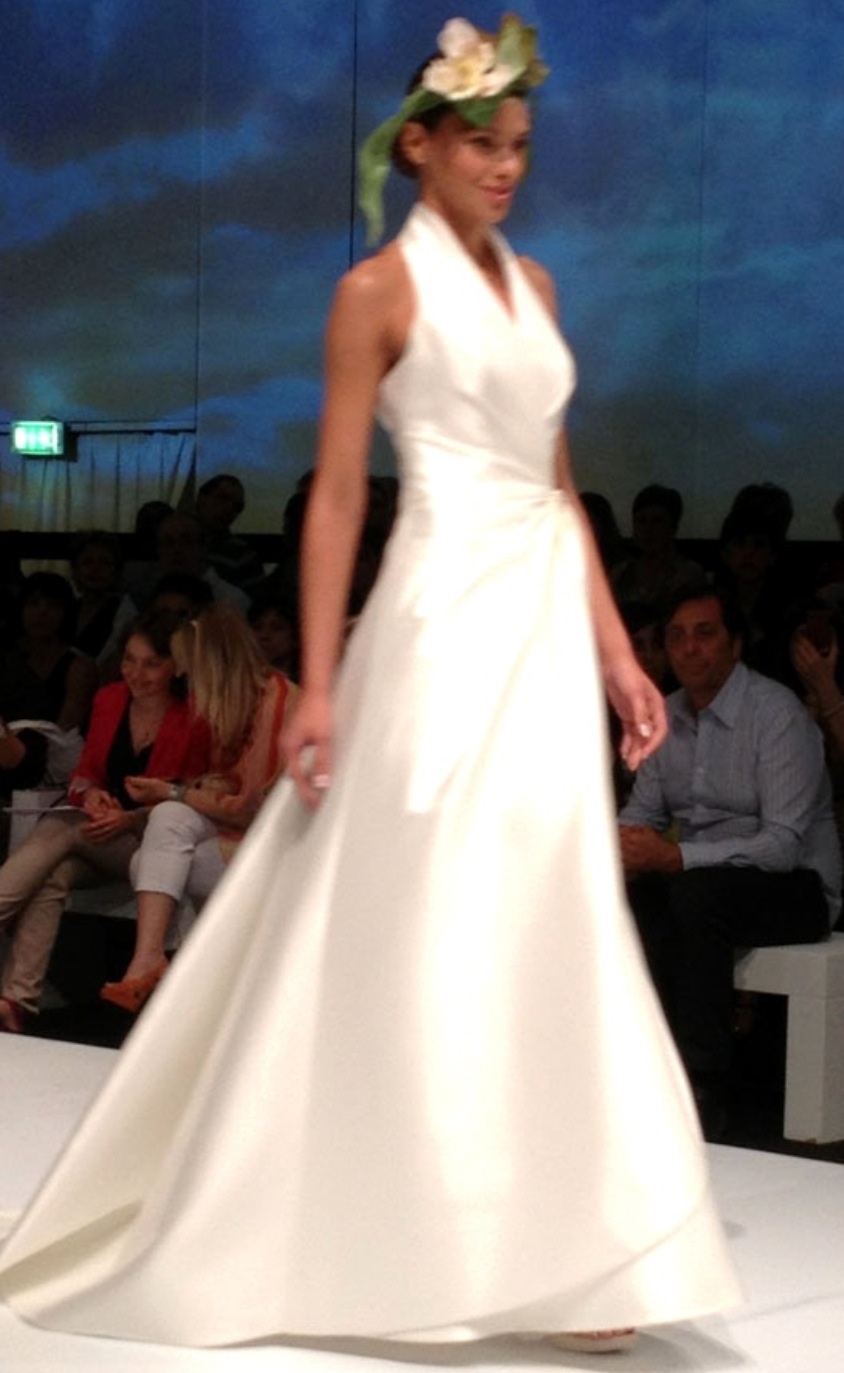 Indossando un simpatico cerchietto verde e marrone in stile fatine –come a personificare le spose di tutte le stagioni- sembrano arrivare dal mondo dei boschi: romantiche sì, ma determinate. Donne appassionate e sognatrici che sanno però ciò che vogliono per essere felici, questo sembra essere il messaggio conclusivo trasmesso anche dal monologo corporeo dell’artista sulla passerella a ritmo di musica a fine sfilata.