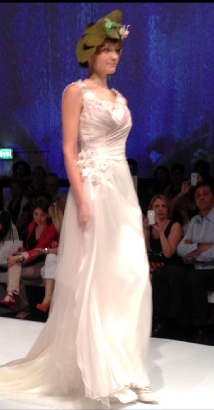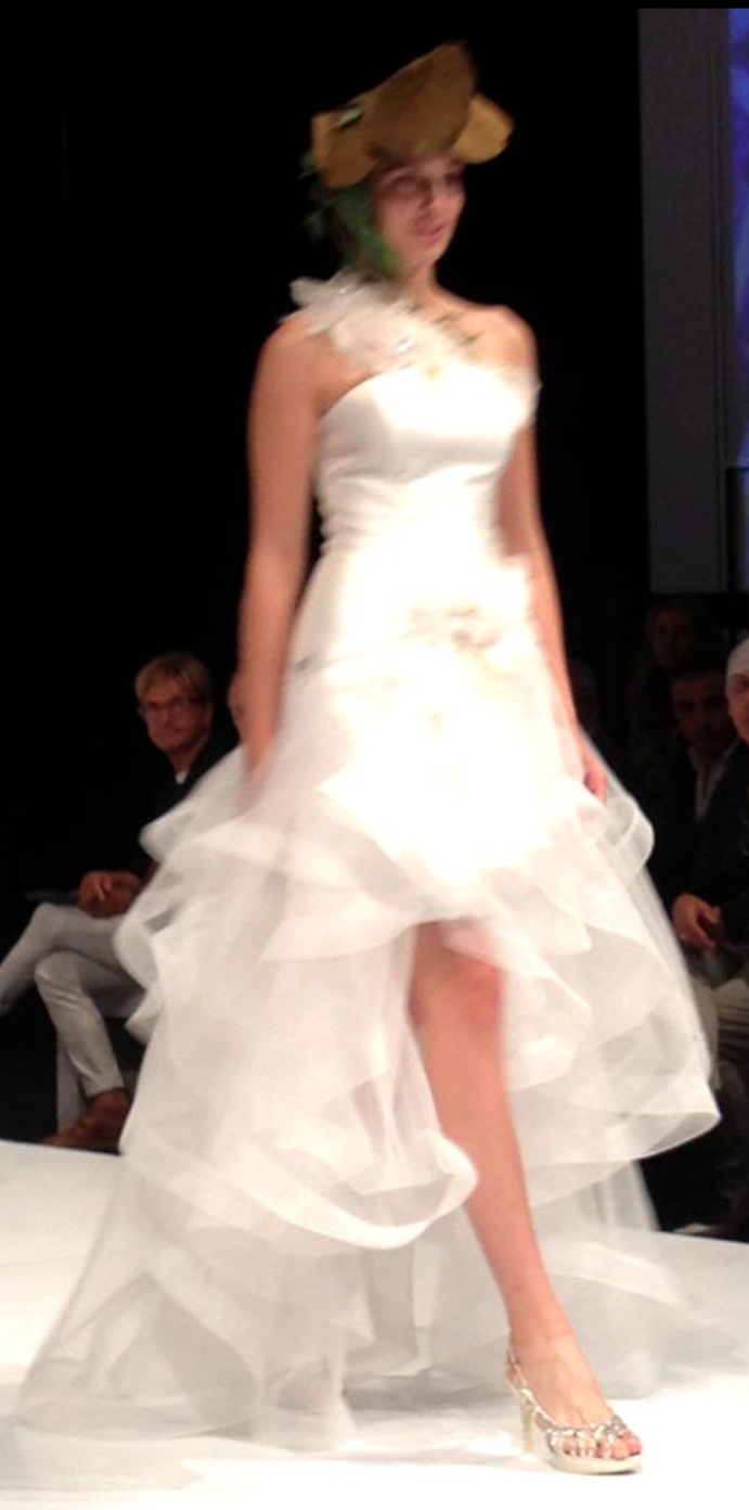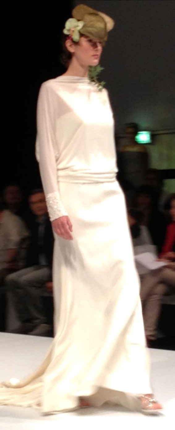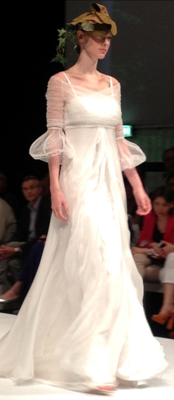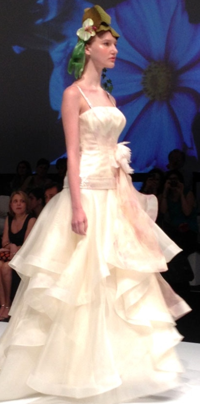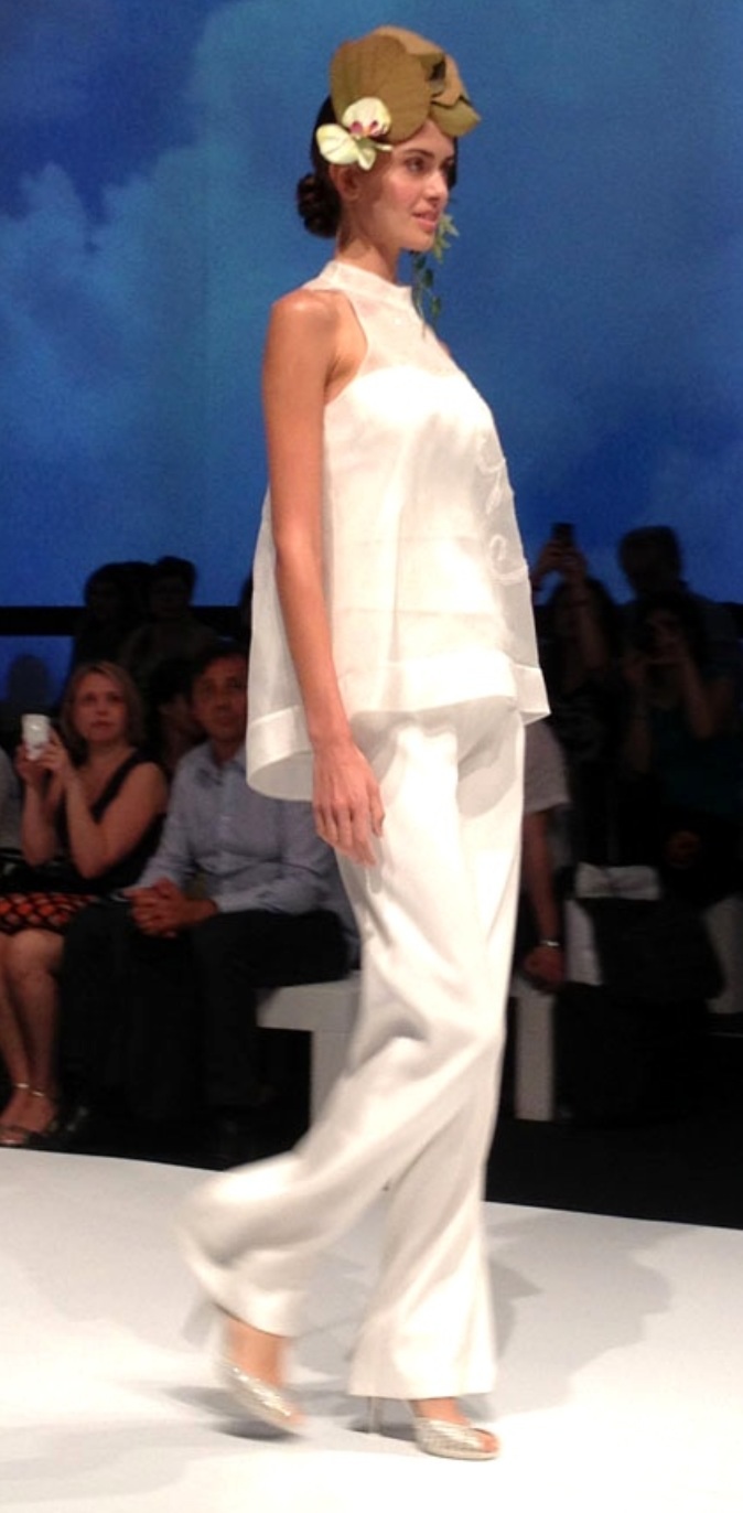 Indossando un simpatico cerchietto verde e marrone in stile fatine –come a personificare le spose di tutte le stagioni- sembrano arrivare dal mondo dei boschi: romantiche sì, ma determinate. Donne appassionate e sognatrici che sanno però ciò che vogliono per essere felici, questo sembra essere il messaggio conclusivo trasmesso anche dal monologo corporeo dell’artista sulla passerella a ritmo di musica a fine sfilata.