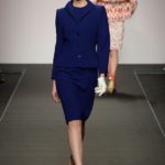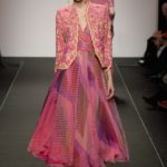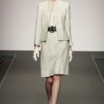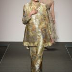 La parte centrale della collezione, fatta di tailleur e abiti dove è evidente la cifra stilistica della Couturier milanese, non manca di dettagli orientalentaleggianti: l’intera collezione è così coerente perché di fatto ha una unica e medesima fonte di ispirazione. Ciò si nota a volte nelle spalle delle giacche dritte o pronunciate all’esterno, o le baschine e le cinture che segnano il punto vita come fossero obi giapponesi; anche una semplice cintura su un abitino a balze di sapore bon ton, acquista una suggestione diversa se arricchita da un gioiello che ricorda un ramo di pesco. Dove si rivela la capacità sartoriale della stilista è proprio nelle giacche con giochi di nervature e sbiechi che richiedono saper fare, tempo, lavoro attento. Non è meno impegnativo il lavoro necessario a comporre a mano le pieghe, a ricamare, o ad applicare sull’abito dei fiori; o scegliere l’intarsio dei tessuti; o per ottenere su una gonna con uno sbieco e un leggero drappeggio, l’elegante effetto del sari indiano. Ma l’Alta Moda è questo, un lavoro sapiente e paziente, che mette in moto mestieri antichi che non hanno fretta, perché le mani qui sono più esperte delle macchine. Ogni capo è esclusivo, unico, irripetibile. Ricordo con quanta soddisfazione una persona che ha lavorato con Gigliola Curiel (la madre di Raffaella) mi raccontava: “Noi non conoscevamo le pinces, la rotondità del seno la creavamo con il ferro; lavoravamo tanto, giorno e notte, ma che soddisfazione quando vedevamo gli abiti indossati all’ apertura della Stagione della Scala”.