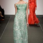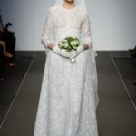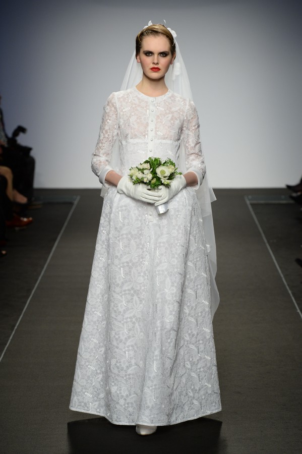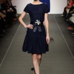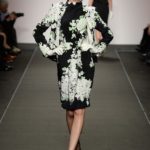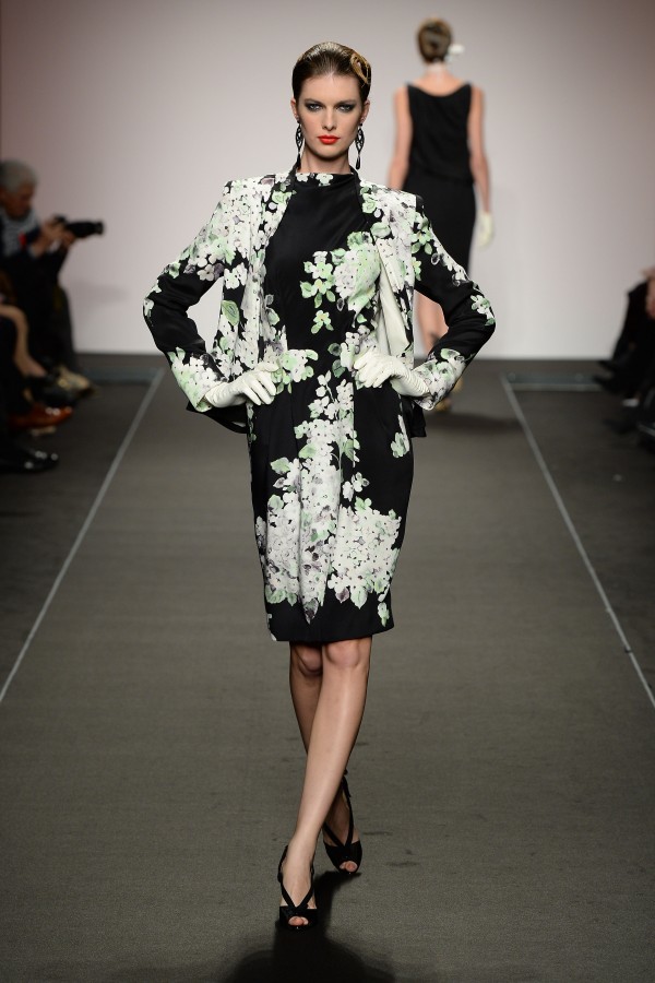 Torniamo alla collezioni. Gli abiti per il giorno sono i tipici “curiellini” eleganti e di particolare vestibilità da portare rigorosamente con guanti. Gli abiti da cocktail sono in chiffon leggeri e movimentati da volantini e volute a sbieco; quelli in crêpe sono in nero, blu, turchese, rosso, bianco e bianco nero. L ‘ispirazione orientale in questa parte della collezione la troviamo nelle stampe floreali o nelle applicazioni di fiori che fanno pensare immediatamente al Giappone. Per ultimo, come da tradizione, l’abito da sposa, particolarmente castigato rispetto a ciò che siamo abituati a vedere in questi ultimi anni -chiusura a girocollo, maniche lunghe, velo di tulle con applicazioni di fiori- : bello nella sua semplice, non era all’altezza del resto della collezione.