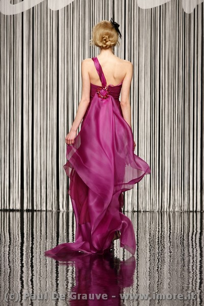 Per la sera abiti monospalla tono su tono, leggeri con drappeggi e profonde scollature, oppure ricoperti quasi interamente di paillettes dai colori forti, decisamente kitsch. Vediamo poi miniabiti con balconcino di raso e gonne a sbuffo.