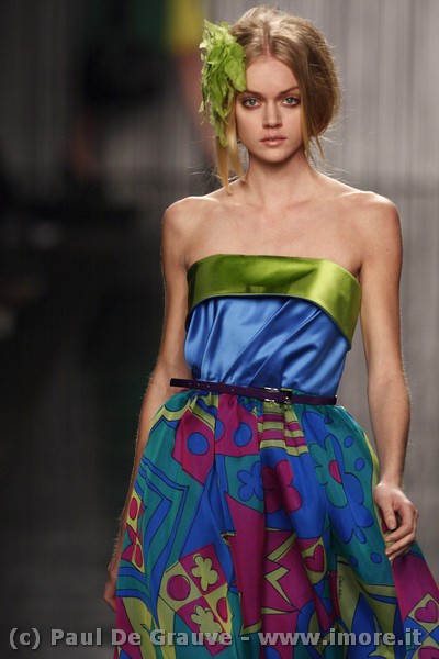 In ultimo uno sguardo agli accessori: sulla passerella un’alternarsi di decolleté gioiello e stivali scamosciati; i tacchi sono sempre alti ma con punte decisamente soft. Le borse più voluminose diventano soffietti da tenere al guinzaglio oppure pochette luminose stampa cocco. A completare il look – definito dalla maison “flirtante” – la rete dei collant e quella delle catene bijoux con i simboli delle stampe.