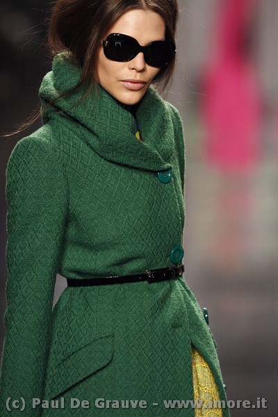 La tendenza porta agli anni ’50, gli anni in cui il colore era un conforto e mai uno shock. Ed è nel colore che lo stilista intravede il talismano scaccia-crisi: indossare abiti all’insegna della leggerezza, della spensieratezza e della positività. La filosofia dello stilista però non ci convince pienamente… i colori strong dal fucsia, al verde alle stampe decisamente troppo floreali non sembrano per niente adatte alla fredda stagione invernale. Ma sono nello stesso tempo, ed in modo particolare le stampe, ben realizzate e di grande effetto.