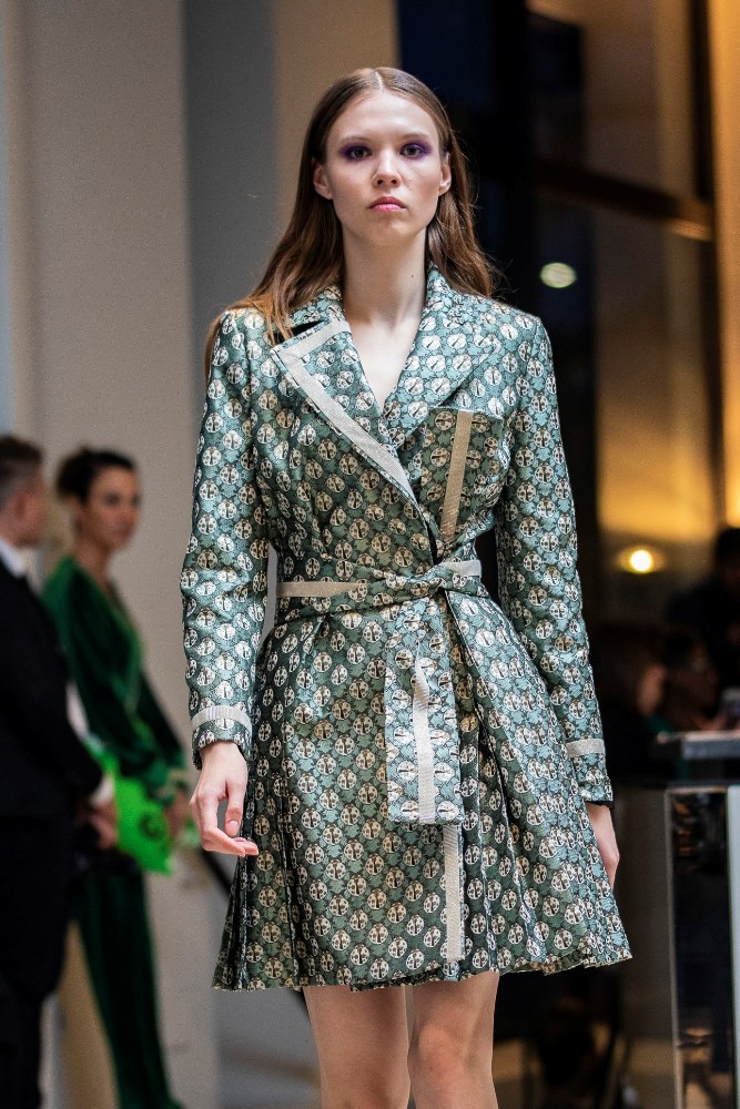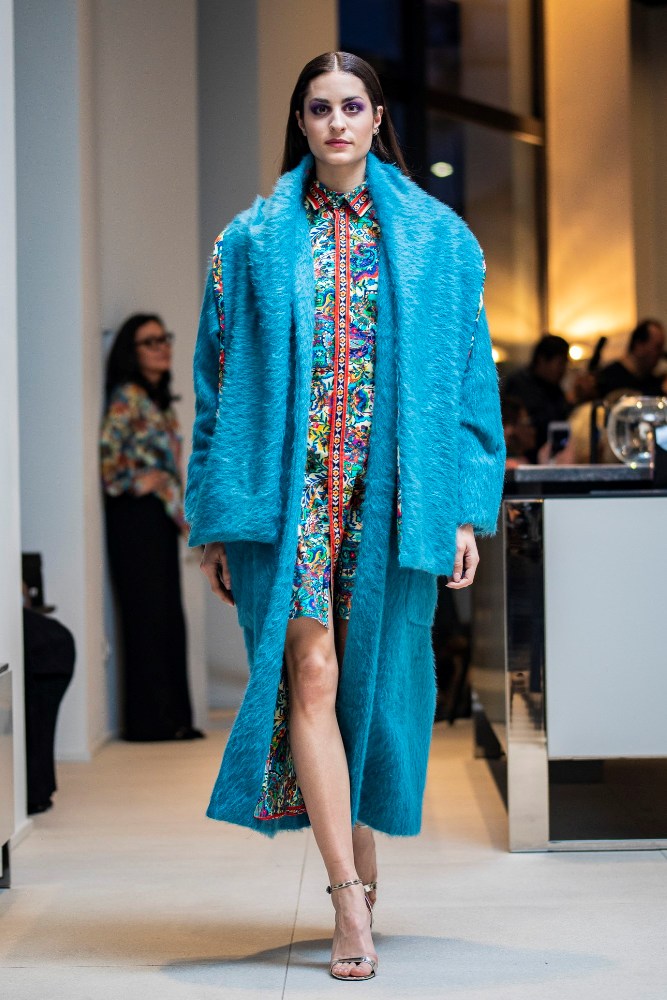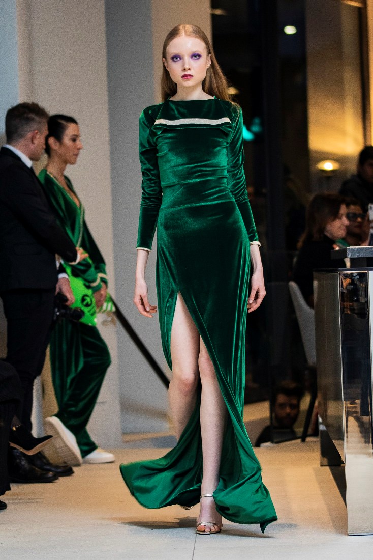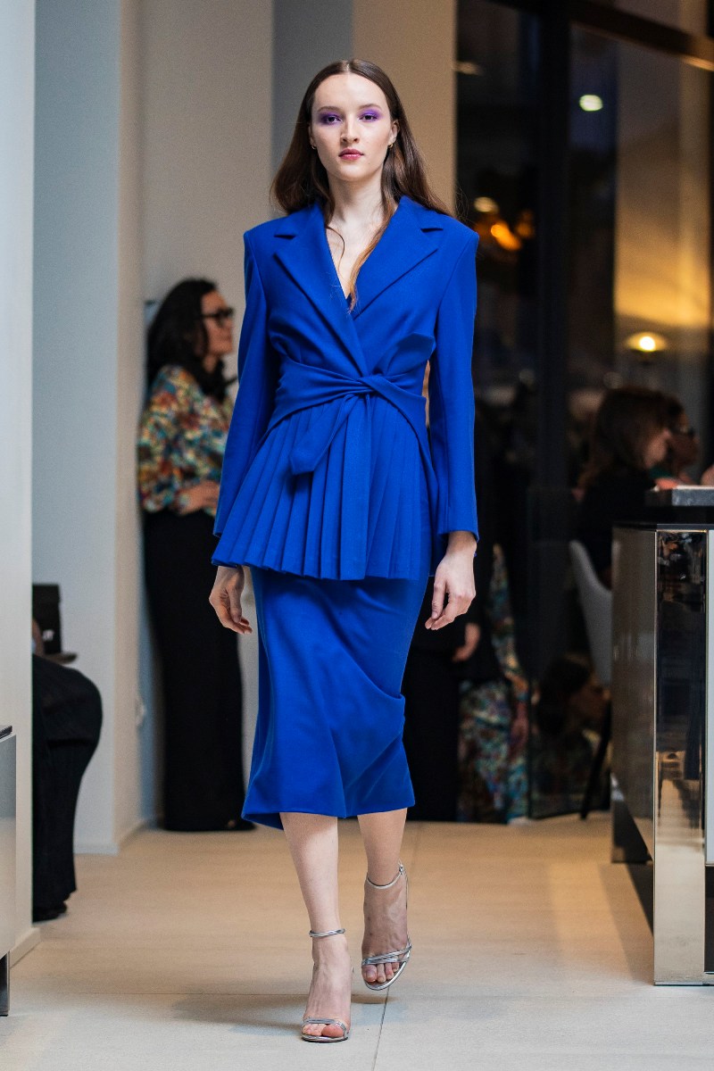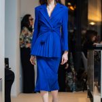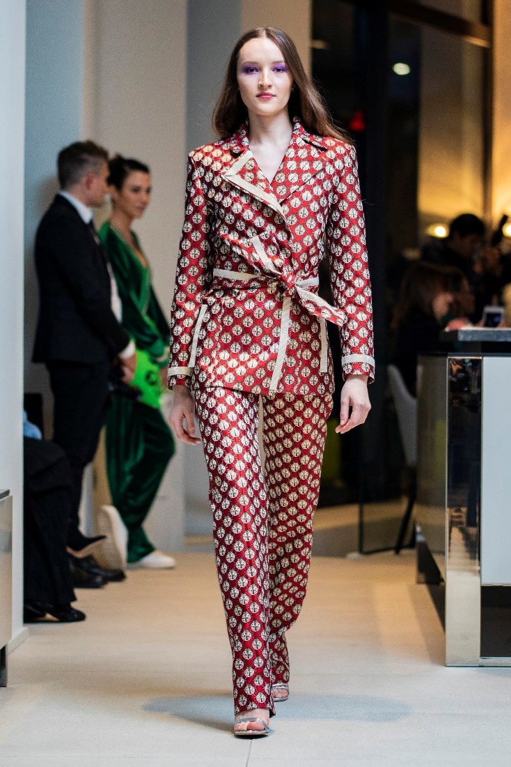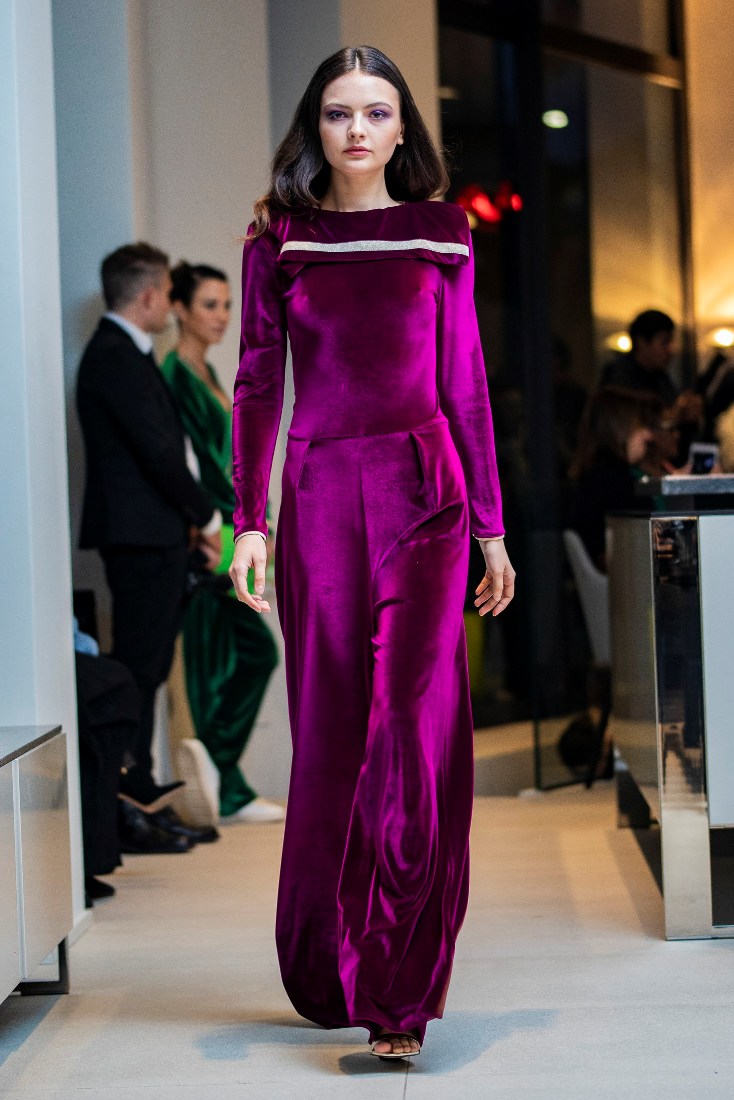 Non abbiamo trovato la stessa forza espressiva nella collezione autunno/inverno 2019-20 presentata a Milano Fashion Week a febbraio 2019. Ciò nonostante continuiamo a riconoscere la designer sa svolgere il suo lavoro, sa costruire gli abiti, ed ha idee chiare su come vuole vestire le donne, quindi i presupposti per prove più incisive ci sono. Suggestivo il nome che Jenny Monteiro ha assegno all’insieme delle sue creazioni “Harmonica”, per dare unità di espressione ad ognuna di esse, e inoltre significativo della visone della stilista riguardo al suo lavoro, perché l’armonica ha dichiarato “è uno strumento musicale che parla di libertà e leggerezza ma anche di eleganza e facilità, proprio come dovrebbero essere gli abiti”. Quindi libertà e leggerezza, eleganza e facilità, ricerca estetica e comodità per gli abiti che devono rispondere ad esigenze quotidiane, essere femminili e pratici. Eleganza espressa nelle camicie di seta plissetta, ma anche femminilità espressa nelle pieghe della giacca di un tailleur blu dalla vita sottolineata da una fusciacca annodata sul davanti. Classicità nel cappotto rosso con le maniche raglan. Assoluta semplicità accanto ad un pizzico di sensualità per l’ abito lungo in velluto dal bellissimo verde smeraldo. Ma la stilista sembra privilegiare il colore viola con cui vuol esprimere seduzione e mistero, leggerezza e ambiguità.