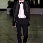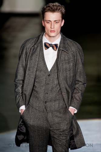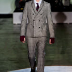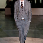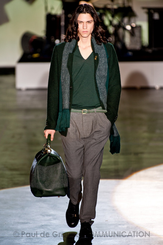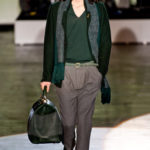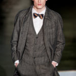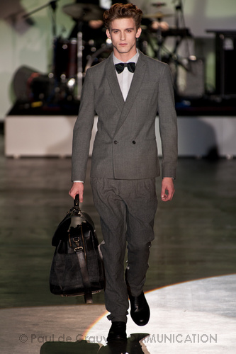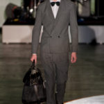 Accessori distintivi della sfilata sono, oltre alla bombetta e al papillon, le maxi bag da lavoro: must have in pelle per completare il look. Tra gli accessori vediamo anche qualche sciarpa in maglia di lana o in lana rasata; quasi completamente assente la cravatta (sostituita dal papillon in nuance tono su tono con la giacca o il maglione).