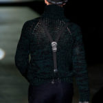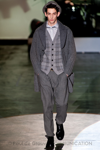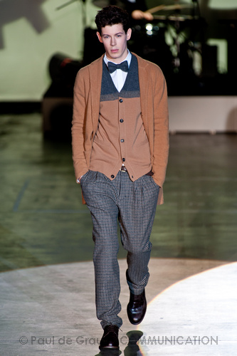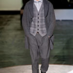 Gli abiti sono decostruiti: vediamo maxi cardigan al posto delle giacche, gilet in maglia di lana a cinque bottoni sopra a camicie con papillon, giacche sopra le magliette, lunghi maglioni di lana pesante a dolcevita portati sopra pantaloni classici.