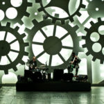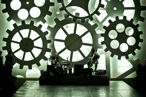 Il sottofondo live acustico dei Footage, con batteria e basso elettrico, è molto d’effetto e accompagna l’intera sfilata; così come lo sfondo della passerella che proietta e poi svela grosse ruote dentate d’orologio.