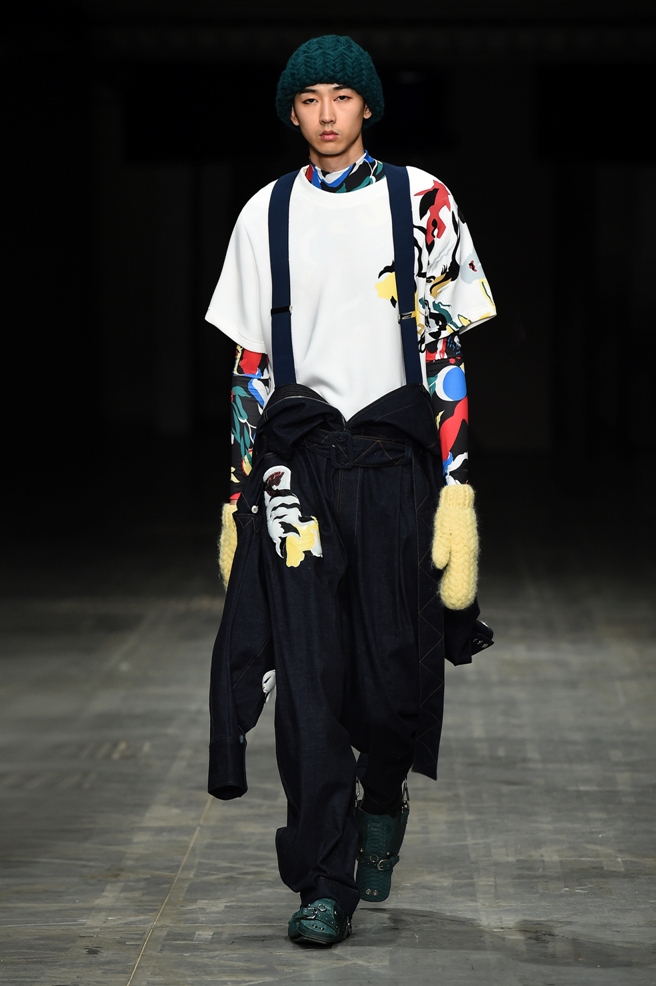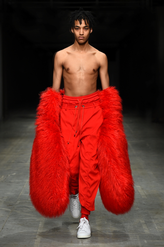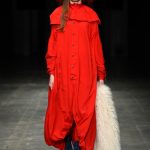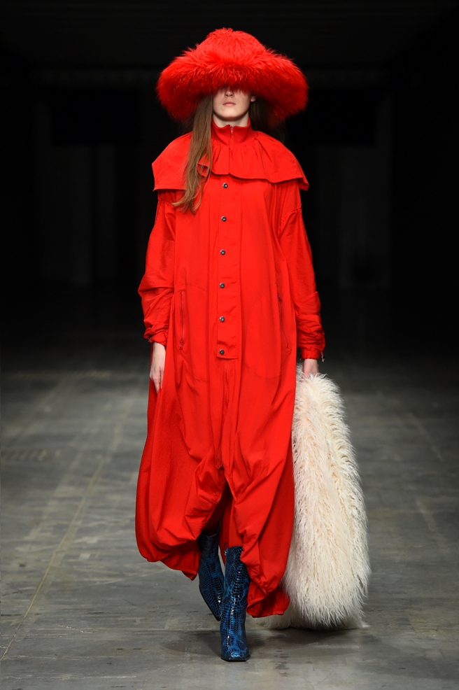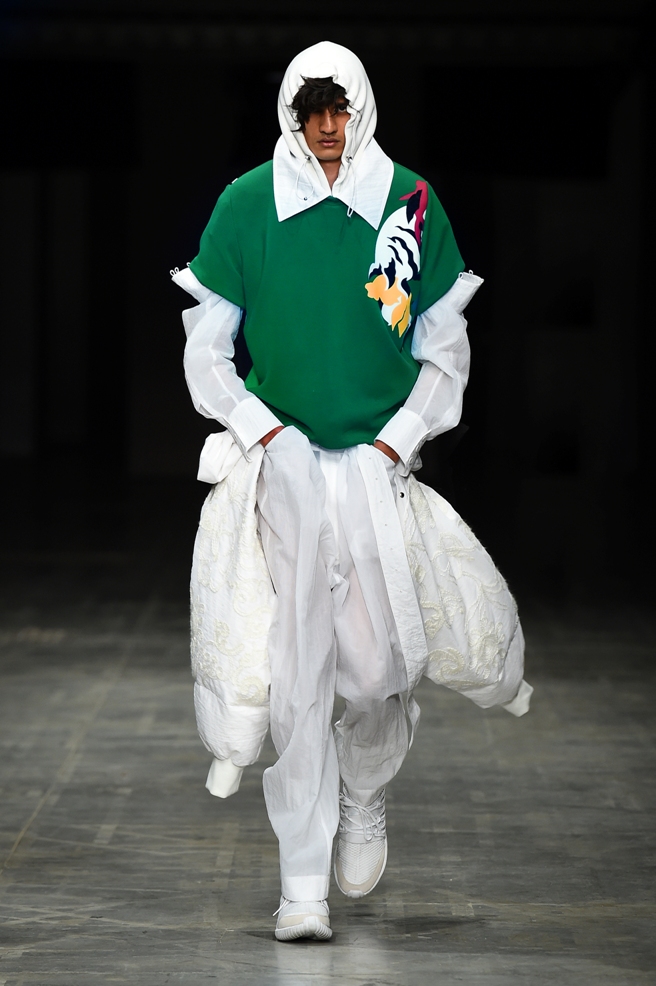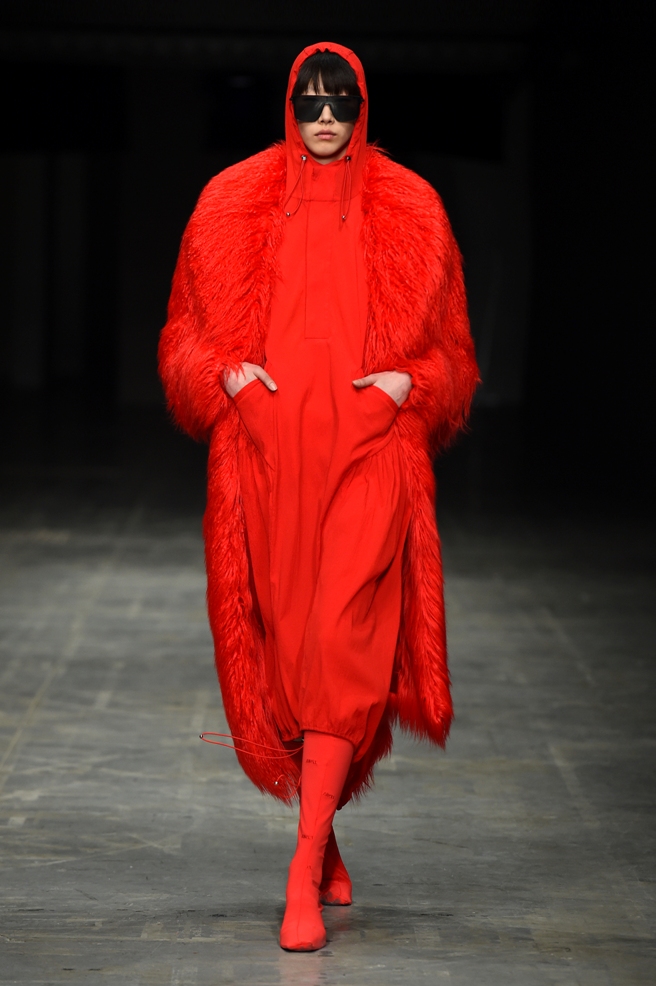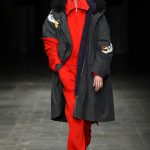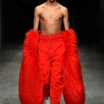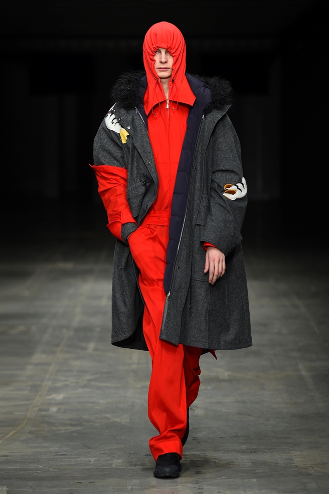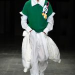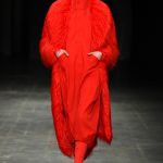 Abbiamo accennato allo spirito giovanile ed eccesivo di Angel Chen. Sorprende la prima uscita di un piumino bianco che nella sua struttura ricorda il guscio di una tartaruga, qualcosa che ti porti addosso e che ti è estraneo: una sensazione questa che si ripresenta di fronte all’uscita maschile, pantaloni rossi con le mani coperte da due protuberanze lunghe fino al pavimento che dovrebbero sostituire i guanti; anche la giacca a vento rossa -su abito dello stesso colore con cappuccio- ricorda le tartarughe.
