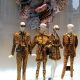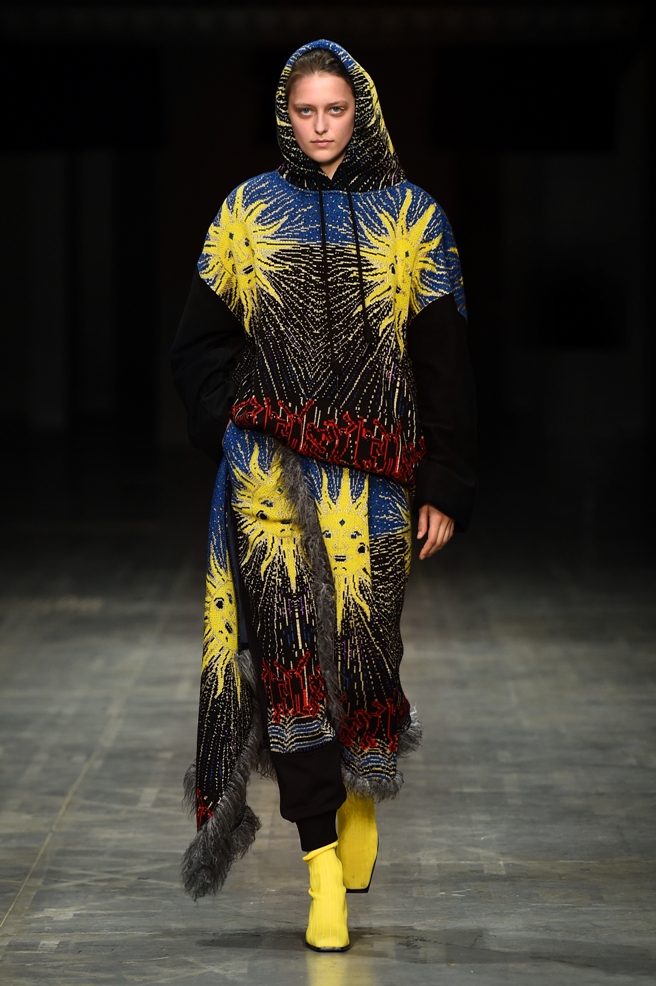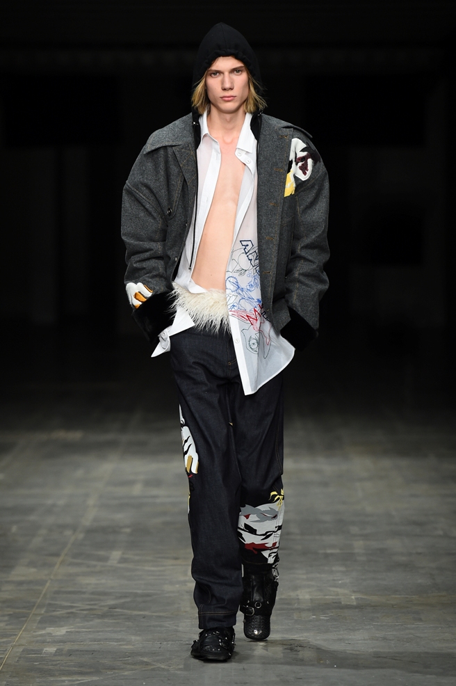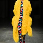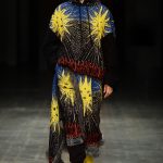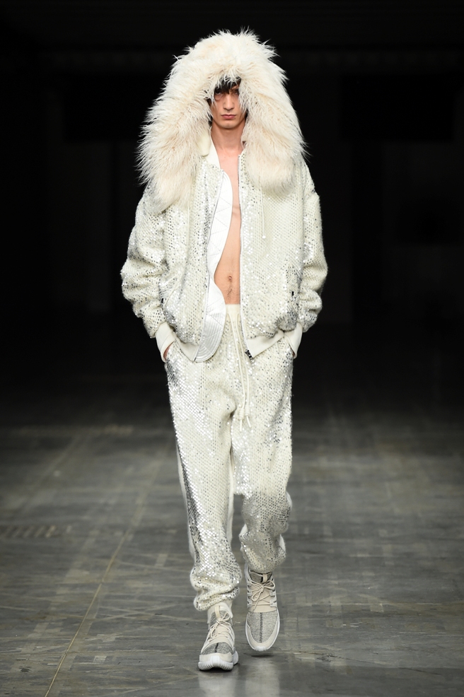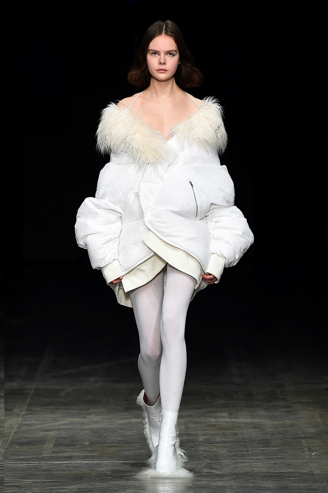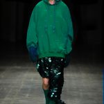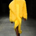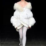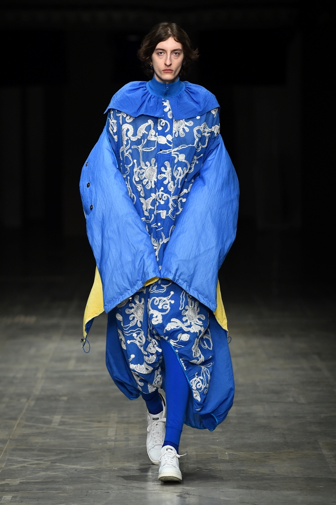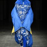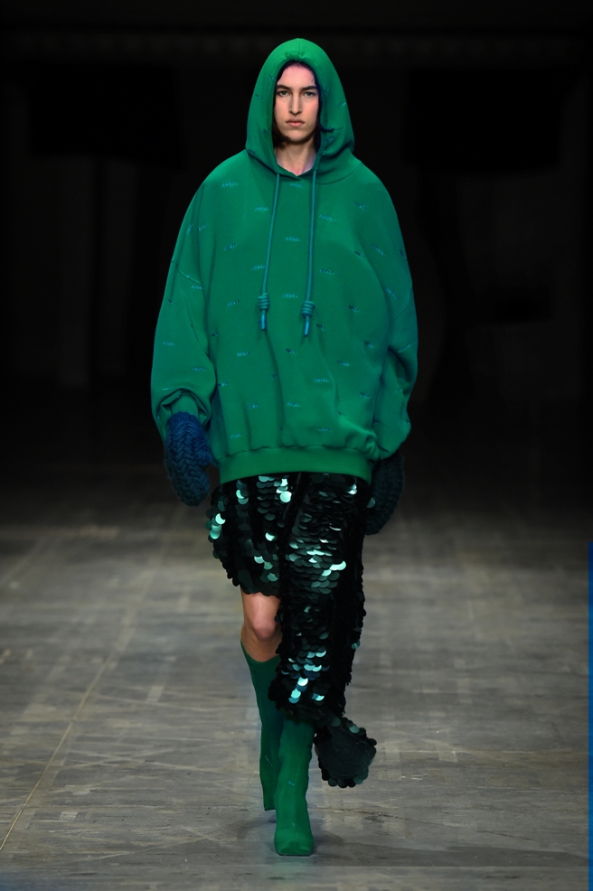 Abbiamo accennato allo spirito giovanile ed eccesivo di Angel Chen. Sorprende la prima uscita di un piumino bianco che nella sua struttura ricorda il guscio di una tartaruga, qualcosa che ti porti addosso e che ti è estraneo: una sensazione questa che si ripresenta di fronte all’uscita maschile, pantaloni rossi con le mani coperte da due protuberanze lunghe fino al pavimento che dovrebbero sostituire i guanti; anche la giacca a vento rossa -su abito dello stesso colore con cappuccio- ricorda le tartarughe.