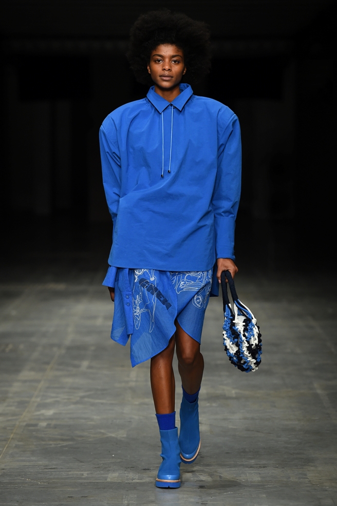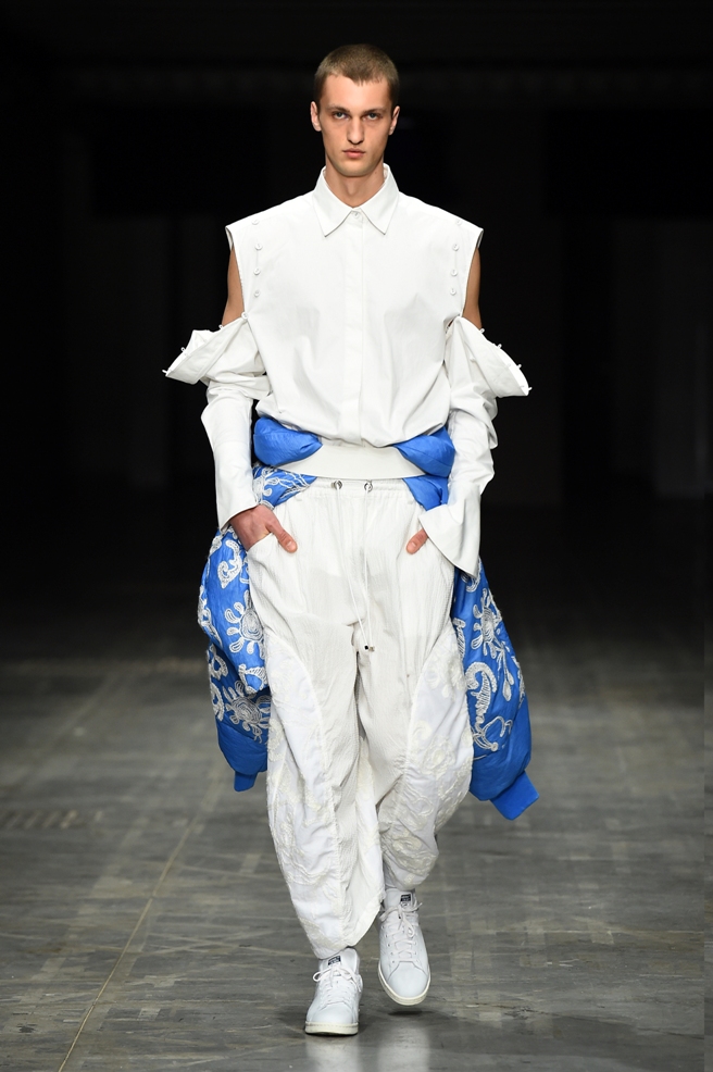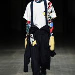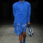 Lo stile genderless trova su questa passerella espressioni più audaci in alcune uscite maschili a cui la stilista regala silhouette tondeggianti grazie ad esempio all’uso della coulisse applicata all’orlo di un capo bianco.