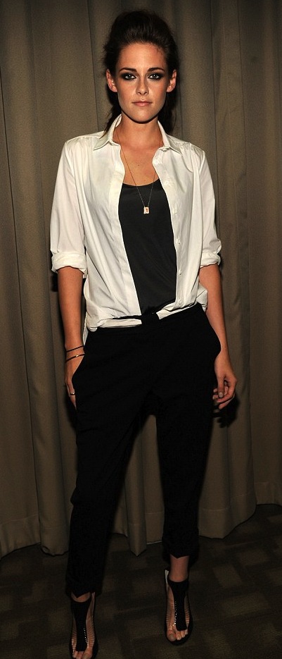 Come se non bastasse votarla continuamente come miglior attrice dell’anno, i giovani la considerano anche tra le celebrità meglio vestite. Carnagione pallida, lunghi capelli corvini e magnetici occhi verdi conferiscono a questa ventitreenne una bellezza gotica, quasi vampiresca: guarda caso anche il suo stile è improntato su questa linea, predilige il colore nero, e vi aggiunge qualche tocco rock. Il suo capo preferito sono i pantaloni, di ogni tipo, di lunghezza normale, fino alla caviglia oppure shorts, skinny o anche maschili. È quindi frequente vederla ad eventi come conferenze stampa, con indosso questo capo, che conferisce al suo modo di vestire un’impronta rilassata ed adatta ad una ragazza, a cui non è detto che piaccia particolarmente mettersi in ghingheri. La varietà di look che riesce a fornire è comunque impressionante: completi maglietta e shorts abbinati; giacche in toni come il grigio o in stampe psichedeliche con collo nero in contrasto, top bianco, pantaloni aderenti di pelle nera con ai piedi decollettes a punta, nere o colorate; giacca di pelle, top, jeans skinny alla caviglia e stringate maschili, il tutto di colore nero; completi composti da giacca e da pantaloni larghi mascolini, abbinati a top bianco e stringate maschili nere. Uno stile che la Stewart adotta senza problemi anche nella vita quotidiana, a parte forse i tacchi: spesso, una volta finita la sfilata sul tappeto rosso per i fotografi, se le sfila e indossa per l’ intera serata scarpe da ginnastica. D’altra parte, la sua accoppiata preferita è quella formata da jeans e scarpe da ginnastica, ovvero l’abbinamento più casual e pratico che esista, prediletto dalla maggior parte delle donne nella vita di tutti i giorni. Tuttavia, quando la giovane attrice si presenta in pubblico con questi capi, abbinati ad una maglietta bianca a maniche corte da cui si vede il reggiseno nero, non dà un esempio di buongusto.