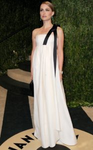 Natalie Portman, attrice americana dagli occhi color nocciola e dai lunghi capelli castani (anche se per recitare in “V per Vendetta” (2005) , di James McTeigue, ha accettato di farsi rasare a zero, mentre alcuni mesi fa, sempre per un ruolo, si era tinta i capelli di biondo), impegnata a recitare fin da bambina, è diventata testimonial di vari prodotti cosmetici e del profumo “Miss Dior” nel 2011, quando ha dominato l’intera stagione dei premi. Ricordiamo che è arrivata anche a vincere l’Oscar come miglior attrice protagonista, per la sua interpretazione di Nina, ballerina classica che, scoprendo il suo lato oscuro, finisce per impazzire, ne “Il Cigno Nero” di Darren Aronofsky. Negli ultimi due anni l’attrice americana ha avuto poche occasioni di sfoggiare sul tappeto rosso abiti della casa di moda francese, perché si è occupata di suo figlio Aleph, nato proprio pochi mesi la vittoria dell’Oscar, e l’anno scorso ne ha sposato il padre, il ballerino e coreografo Benjamin Millepied, poco dopo essere tornata a recitare: quest’anno sarà in “Thor: The Dark World” di Alan Taylor, seguito del film di successo del 2011, ha partecipato ai due nuovi film di Terrence Malick (uno s’intitola “Knight of Cups”, l’altro è ancora senza titolo), e al momento sta girando il western “Jane Got a Gun” di Gavin O’Connor.