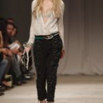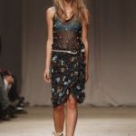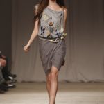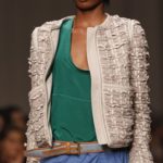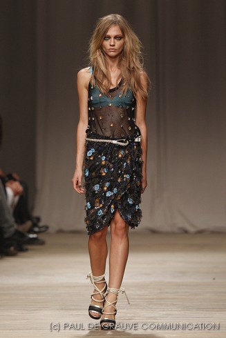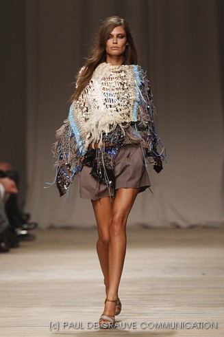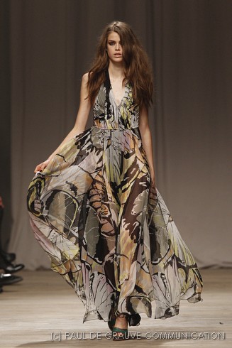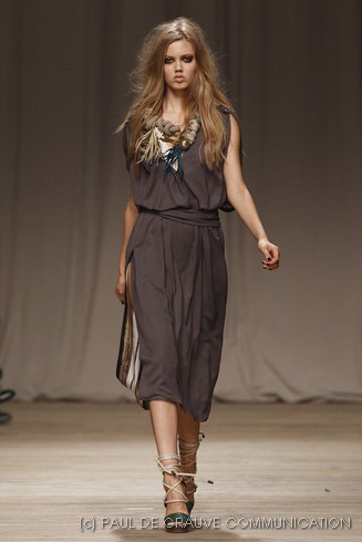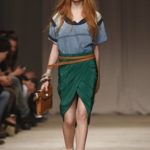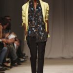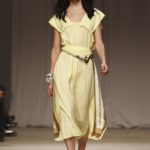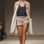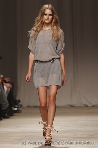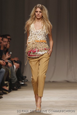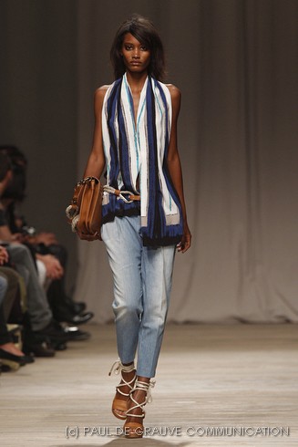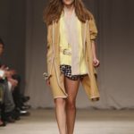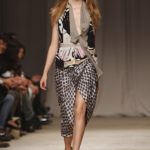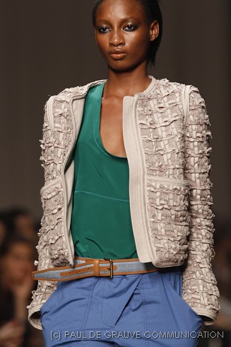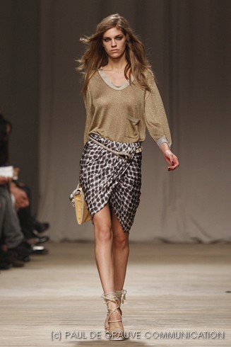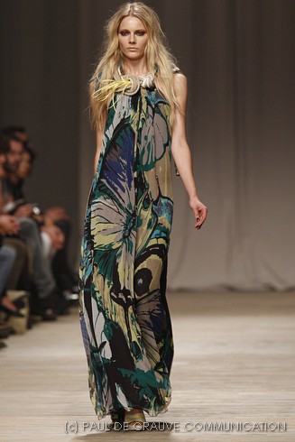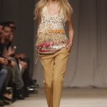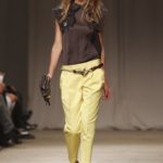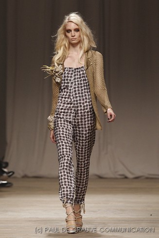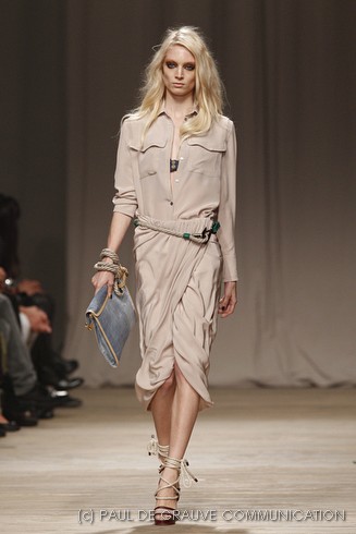 L’accessorio di punta è la borsa: è una busta, midi o maxi, da portare a mano. E’ profilata da dettagli in corda e tessuto, gli stessi delle scarpe. E sempre in corda sono i bracciali, le spille e le cinture, un richiamo di ispirazione marina. La palette è calda: si passa dal colore più neutro della sabbia al beige carico, fino ad arrivare al dorato. E poi grigio, giallo, blu e verde smeraldo e qualche tocco di bianco. Sui tessuti ricorre la stampa del maculato, reinterpretato in versione vagamente anni ’70.