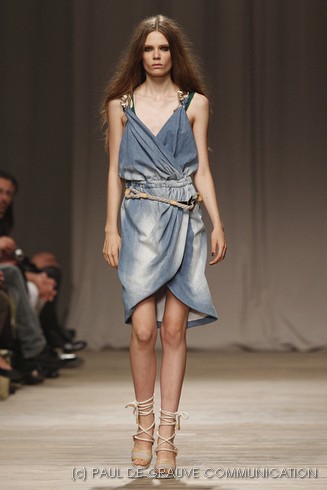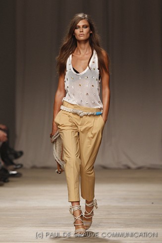 C’è un’attenzione particolare alla maglieria, che puo’ essere traforata o impreziosita da applicazioni e ricami. E non mancano le tute, le bluse leggere e il jeans sbiadito. La donna di Iceberg ha un look sportivo, comodo, ma incede femminile e sicura su sandali in tessuto o in pelle, dal tacco di legno, altissimo. La sera è fatta per gli abiti impalpabili: lunghi e svolazzanti oppure più corti davanti e con la scollatura a bustier.