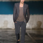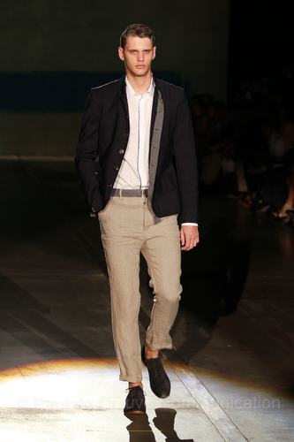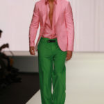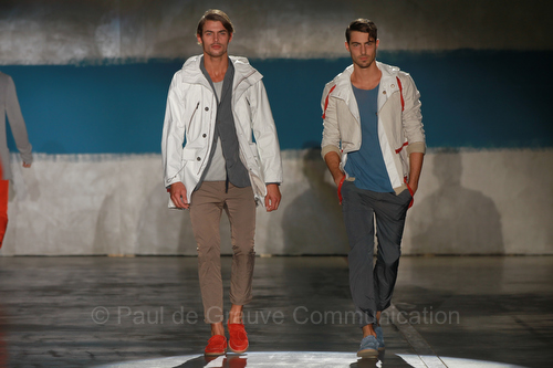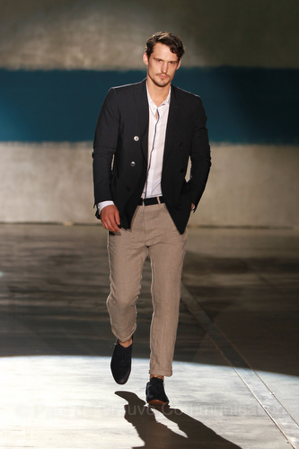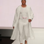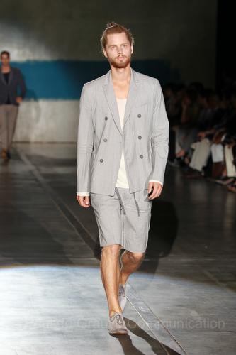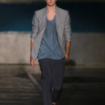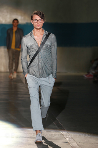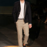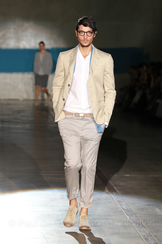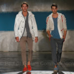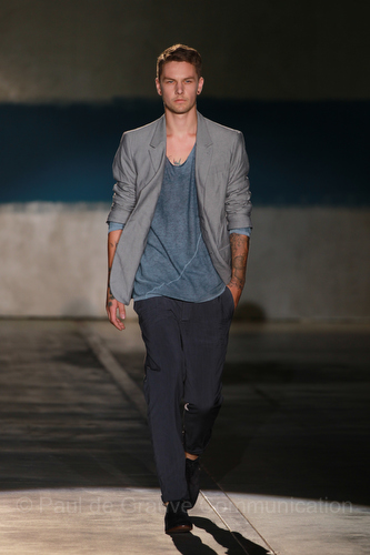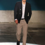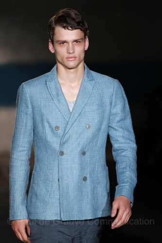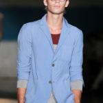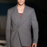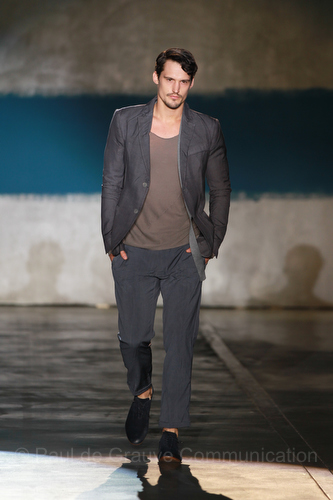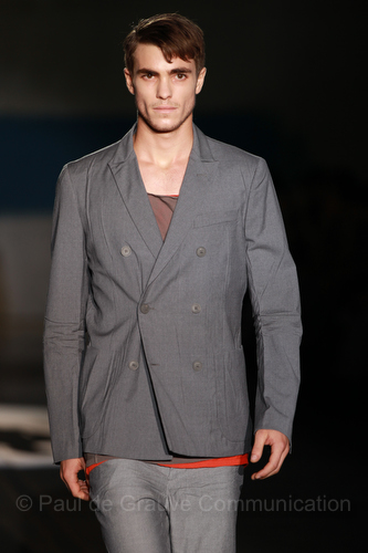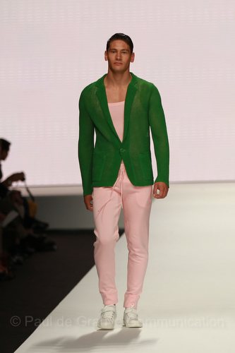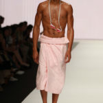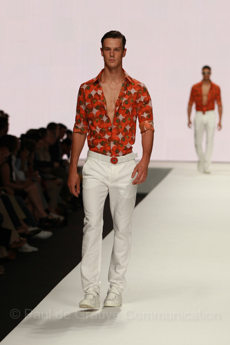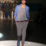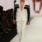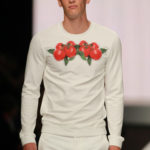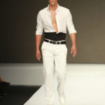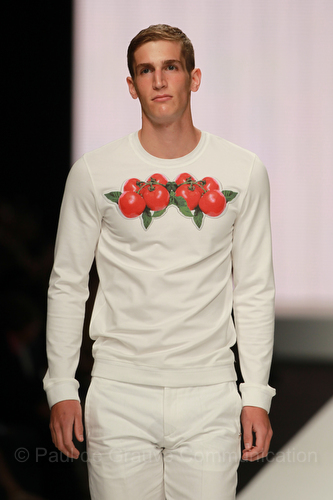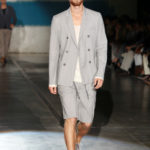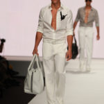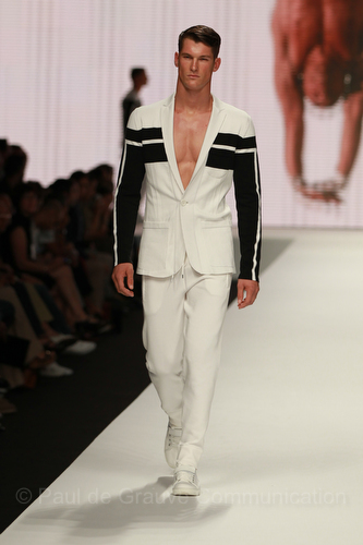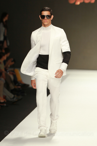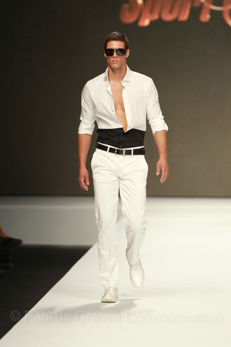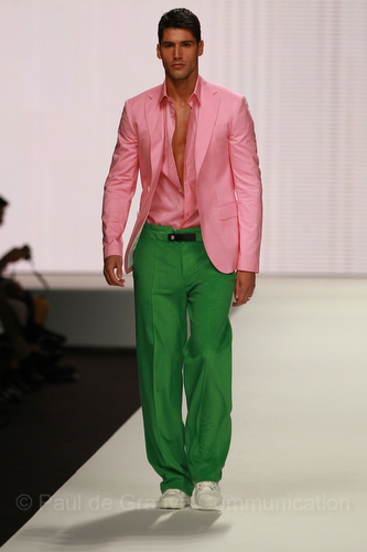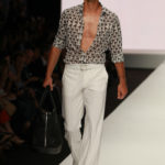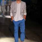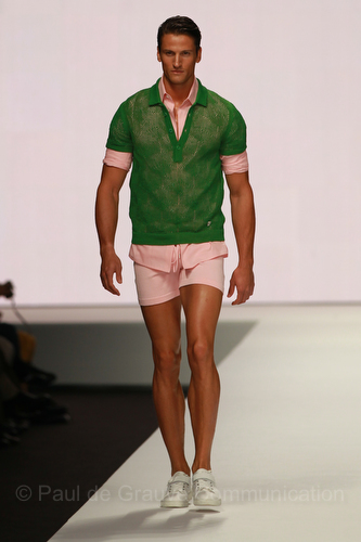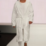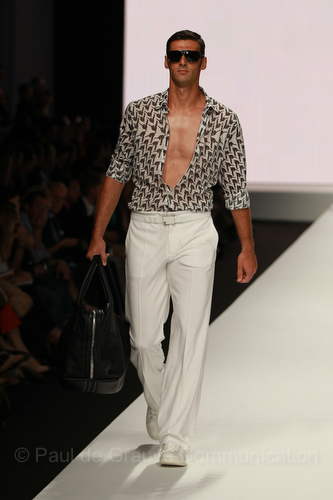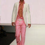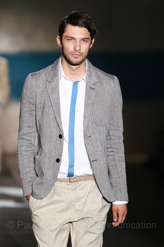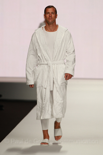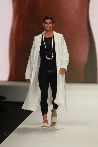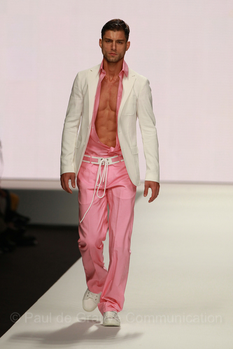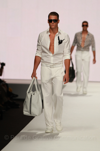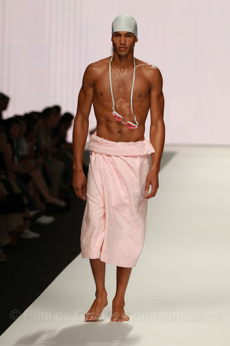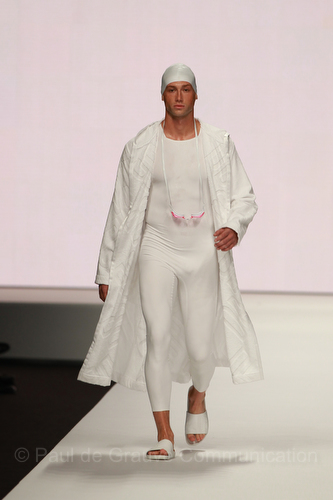 Dirk Bikkembergs, invece, fa sfilare in passerella corpi atletici, abbronzanti, scultorei e presenta una collezione ispirata all’acqua e allo sport del tuffo sincronizzato, come suggeriscono le grafiche icone stampate sulle camicie. L’uomo atleta di Bikkembergs sfila prima in accappatoio bianco o con un telo di spugna rosa annodato in vita (la spugna, ma anche il jersey e il neoprene, utilizzato per i costumi dei campioni di nuoto, sono i materiali scelti per la collezione), poi in completi total white, con qualche linea di nero.