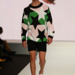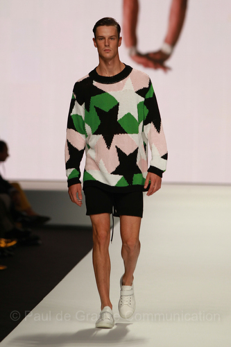 La maglieria è stampata: il patchwork di stelle riprende tutta la palette cromatica della collezione. Le scarpe sono ginniche, allacciate o con strap in velcro.