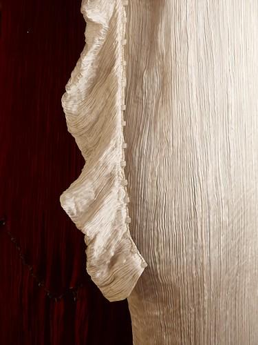 Abiti plissé (i preziosi Delphos), cappe, mantelli, costumi e accessori, provenienti da prestigiose collezioni private americane (Keith McCoy e famiglia Riad), esprimono al meglio l’originale creatività del Maestro, che con la moglie Henriette Nigrin vestì dei più nobili velluti e sete le più eleganti signore dell’altissima società europea e oltreoceano.