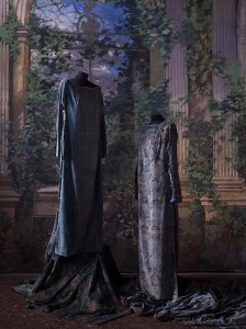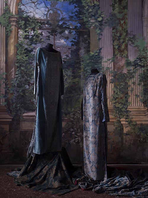Tra gli abiti più significativi esposti in questa rassegna carica di un fascino senza tempo, vogliamo citare: un costume teatrale in velluto di seta stampato in oro con bordura di pelliccia, una sopravveste in garza di seta color glicine stampata in oro con perle di vetro, un mantello con cappuccio in velluto di seta stampato in rosa, verde, oro, quattro magnifici pepli di raso di seta in altrettanti colori, una giacca in velluto di seta color rame stampato in argento, un abito di seta blu stampato in oro con inserti laterali di seta plissettata, un abito di velluto di seta color smeraldo stampato in oro con inserti laterali in seta plissettata con perline, una borsetta in velluto di seta stampato verde con perline di Murano. E si potrebbe continuare menzionando decine di altri magnifici mantelli, cappe, sopravvesti, giacche, abiti, tuniche, ecc