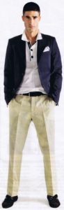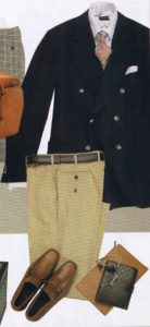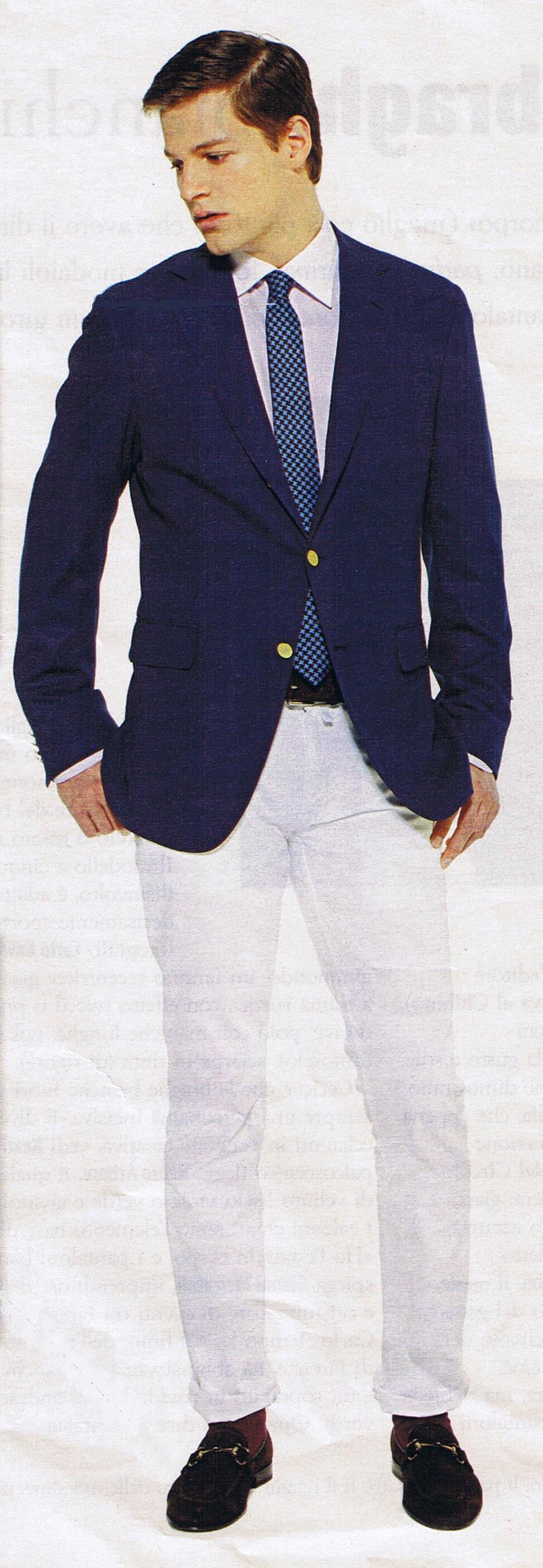 Il secondo tipo di blazer descritto è quello che, abbinato al pantalone di flanella coloniale e alla scarpa marrone, è diventato, soprattutto negli anni ’80, la divisa dell’uomo mediterraneo, il must a cui un vero dandy non può rinunciare, indossabile sia al lavoro che nel tempo libero.