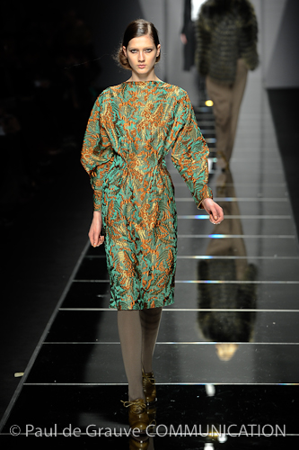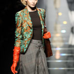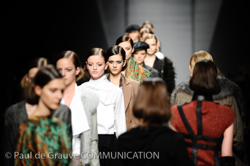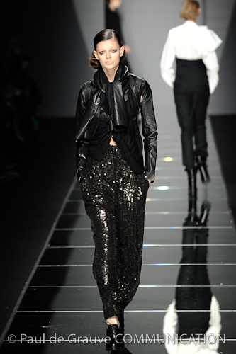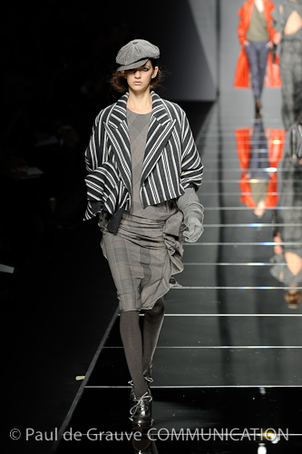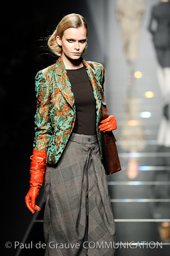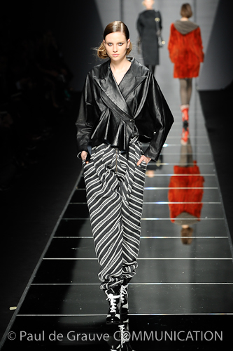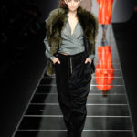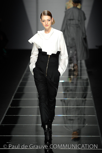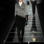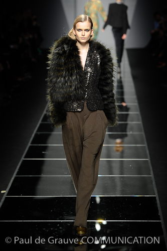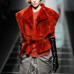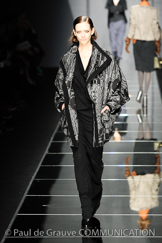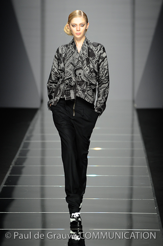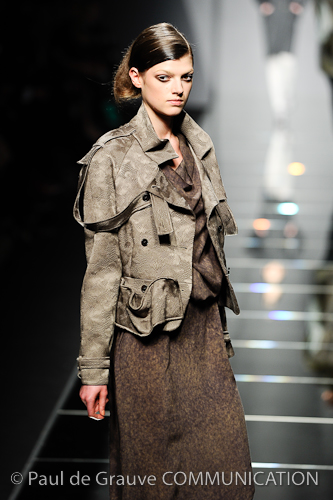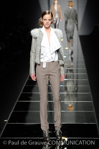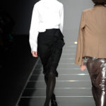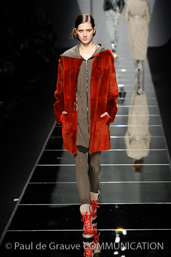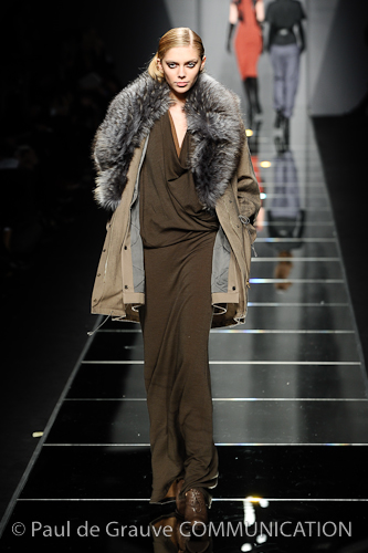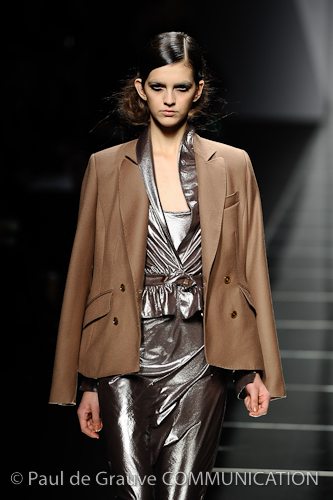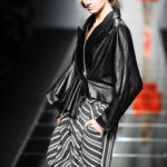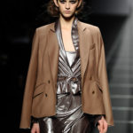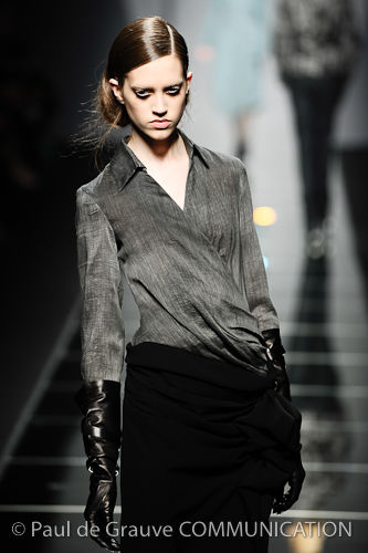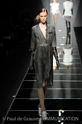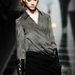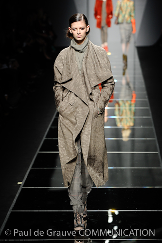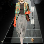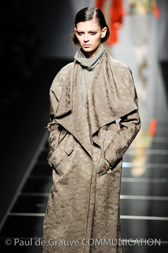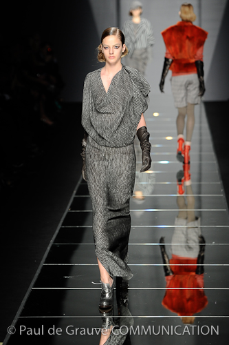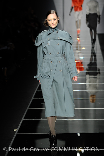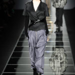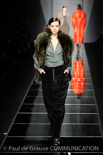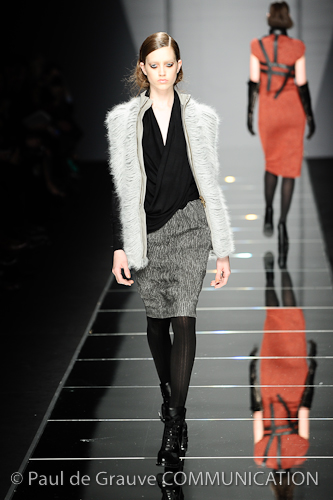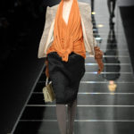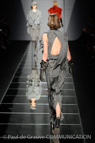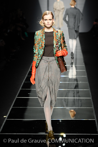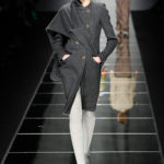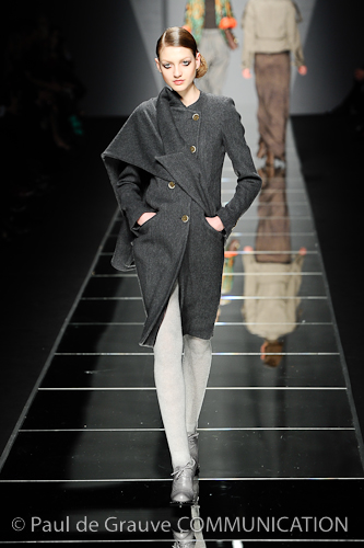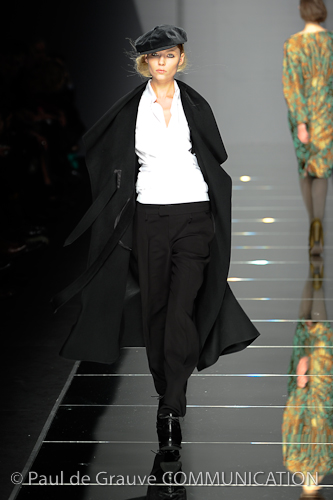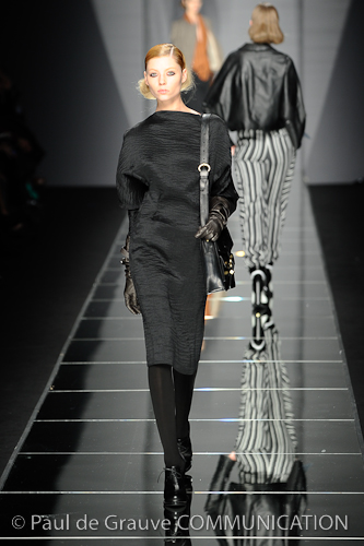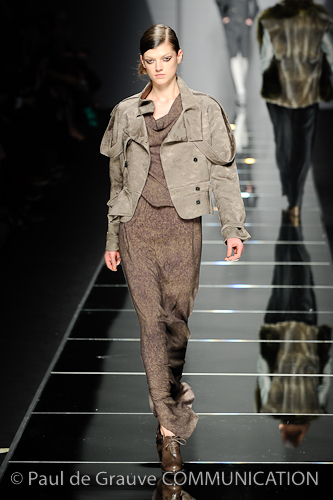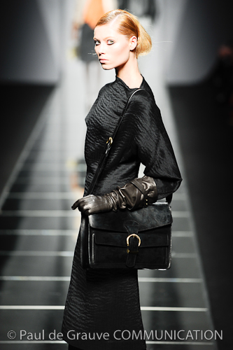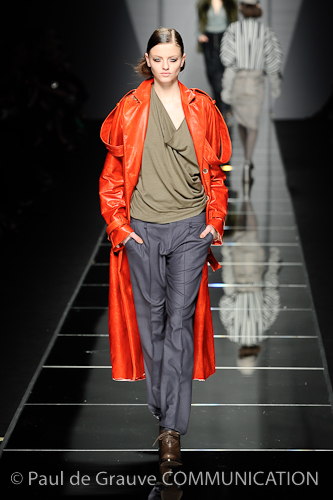 Gli accessori: guanti e borse in pelle sono immancabili per una donna pratica ma attenta al dettaglio. Le calzature si ispirano ai modelli sport wear proponendosi con un tacco piuttosto largo e lacci che rendono il passo più stabile e deciso. La collezione è un mix di volumi e nuove geometrie ma anche di colori che variano dal neutro come la terra fino a un look total black e flash di arancio bruciato o verde giada a confondere e ammaliare al tempo stesso lo sguardo di chi osserva.