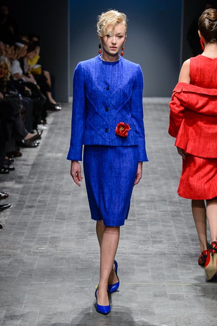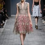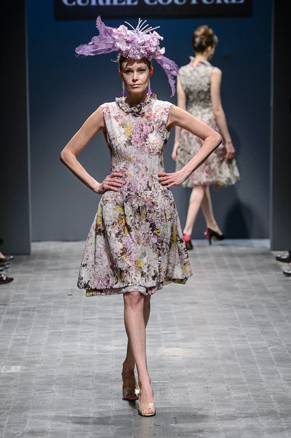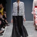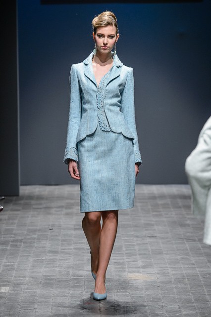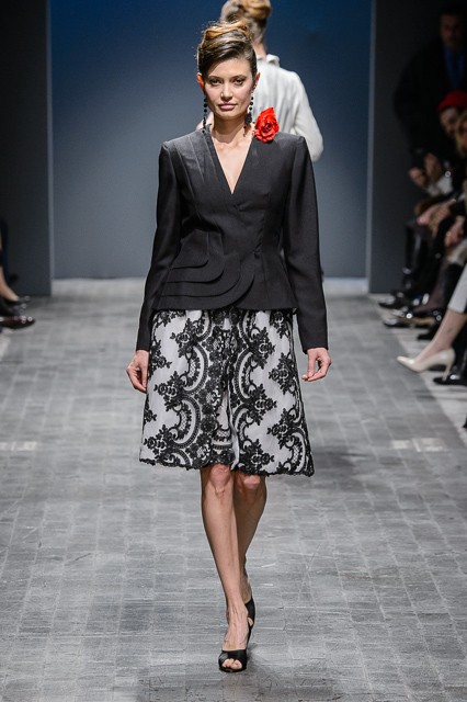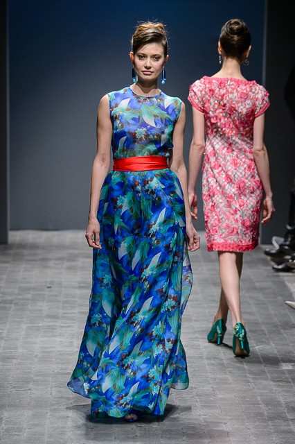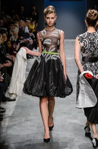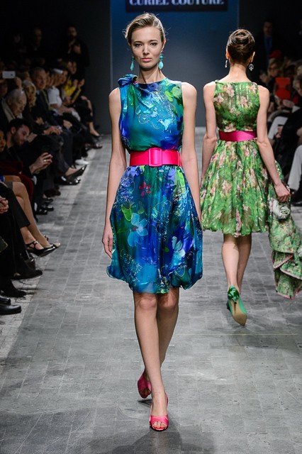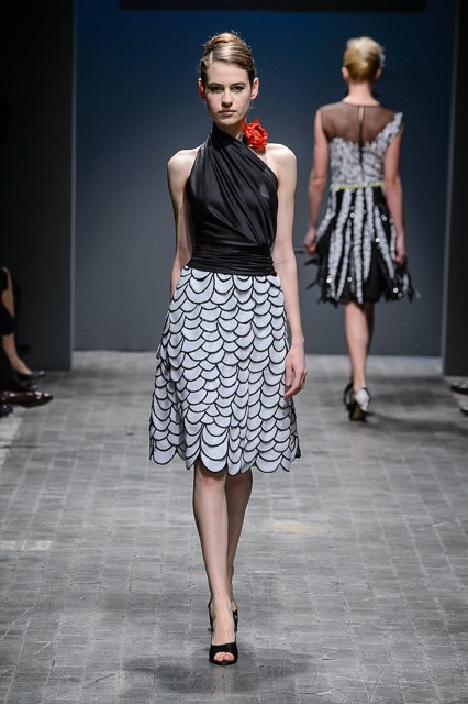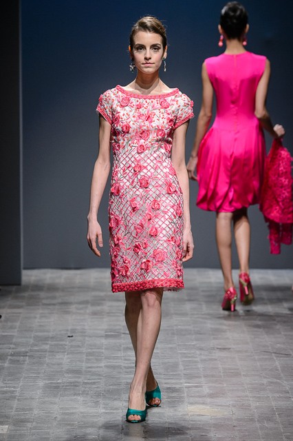 Il contrasto è forte, sicuramente eccessivo, forse utile. La rustica, anzi rozza –se fosse stata solo rustica non avrebbe sorpreso più di tanto- location dell’ex Dogana, accoglie i raffinatissimi abiti per la primavera di Lella Curiel per la manifestazione di Gennaio 2016 di Altaroma. La perplessità iniziale, nel mettere piede nella sala, si sfuma quando le luci si orientano definitivamente sulla passerella; si dimenticano le grezze pareti di calce bianca, i pilastri, il soffitto, e si ammira esclusivamente, senza distrazioni, la pura bellezza di una ricca collezione.