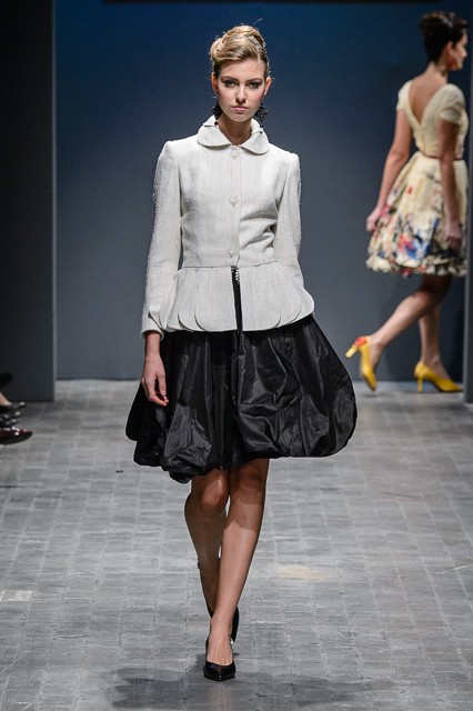 Sono i colori a richiamare l’attenzione già alle prime uscite, sono colori rubati ai fiori, azzurro, fiordaliso, giallo girasole, fucsia, rosa ortensia, rosso papavero, verde prato, ciclamino, tante varietà e tonalità. Sono pochi, ma elegantissimi gli abiti in bianco e nero come la gonna composta da petali bianchi e corpino nero con scollo all’americana; oppure sul nero compaiono ricami e applicazioni in bianco; al contrario un abito bianco è doppiata in pizzo nero, ma un papavero rosso decora la spalla della giacca rigorosamente nera; al rovescio l’abito nero con ricami di foglie di felci argento e gonna nera gonfia a palloncino porta una giacca bianca con una alta baschina costruita come petali di tulipano.