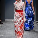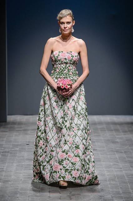 Le stampe sugli abiti di chiffon e sui plissé sono a volte tenue a volte più accese ma si tratta sempre di fiori, rose, clemantis, ortensie. Le foglie invece sono diventate ricami, applicazioni, stampe. Le rose selvatiche sono applicate ad abitini o decorano in un intreccio di foglie e di sottili rami verdi nella proposta sposa di Lella Curiel per la prossima stagione. Abiti-tulipano, gonne-bocciolo, corpino in vimini come un cestino che raccoglie i rossi papaveri della scollatura dritta senza spalline per una gonna color corda decorata con papaveri o ranuncoli dai colori smorzati; pantaloni larghi, plissé e colli rimandano talvolta al disegno di una calle: sono tutti richiami al giardino della stilista milanese.