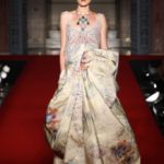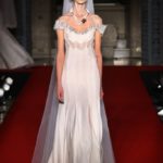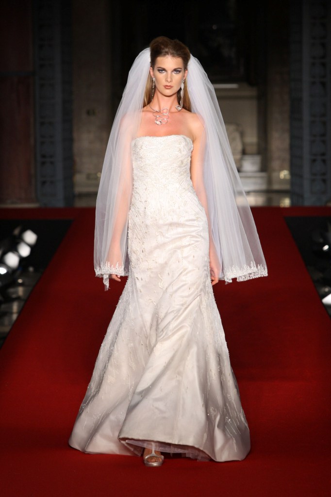 Mariotto da comunicatore consumato non rinuncia a una provocazione, decide di far riflettere sull’attualità con l’ultima uscita proposta in passerella. Dopo un trio di spose vestite in gazar di duchesse e tulle, con corpini ricamati con micro cristalli e linee scivolate con oltre seicento tagli, porta in scena un abito stampato con pagine di giornale, indossato da una modella imbavagliata. Proprio il couturier nella sua uscita in passerella ha strappato quel bavaglio, perché la moda è comunicazione efficace al di sopra dei linguaggi codificati e nazionali, ci insegna una lezione e possiede un potere di trasmissione, di integrazione di messaggi, dettagli e stimoli che Gattinoni ha capito e tenuto a ribadire con la sua sfilata.