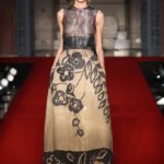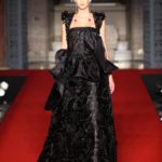 Le jeune fille invitate a Palazzo per il gran ballo di Gattinoni indossano micro foulard ricamati con jais e paillettes in rilievo, trasformati in tuniche e miniabiti preziosismi, abiti eleganti e lussuosi con stampe floreali chiné che ricordano gli acquarelli di Renoir, gonne ampie di juta grezza laminata in oro con ricami in micro-tubetti claire de lune e applicazioni di flanella cristallizzata, gonne drappeggiate e scultoree di taffetas chiné nelle tonalità del rosso, del blu dell’arancio e dell’indaco. Trionfano il ribes e il rosso lampone.